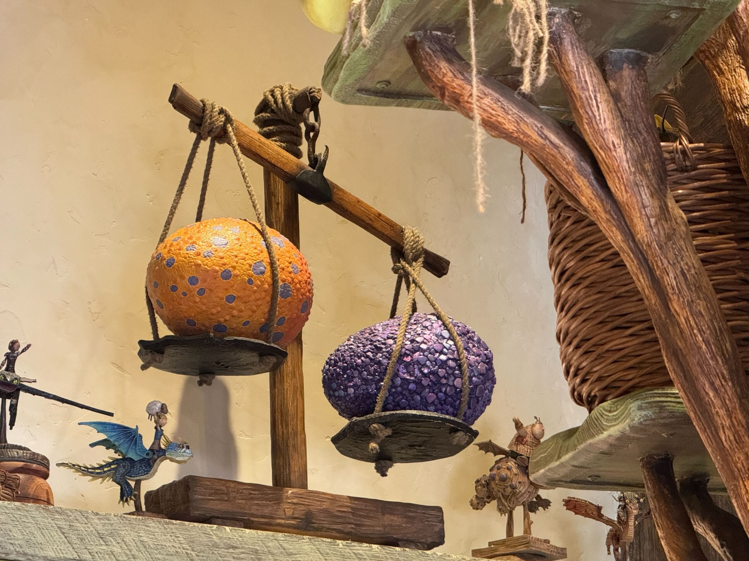 Two eggs are being weighed on a wooden scale atop one display. Small model dragons surround the scale.