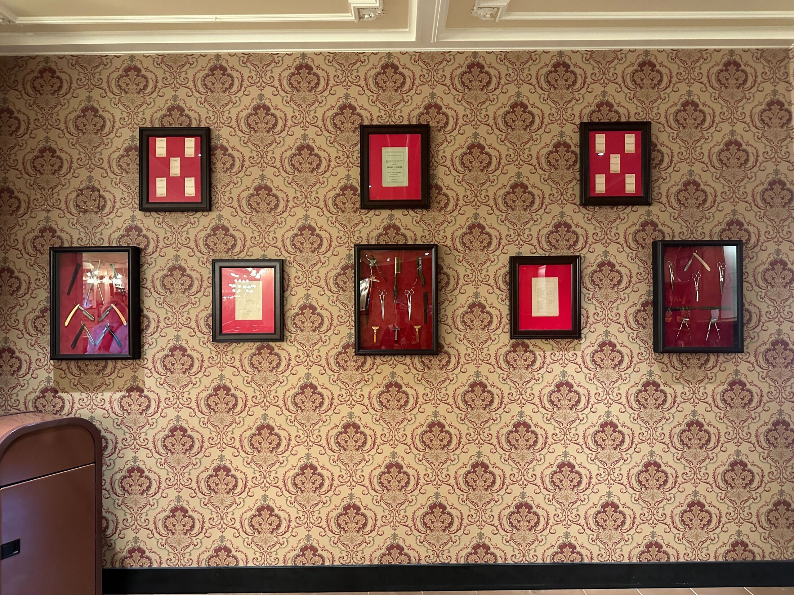 The themed arrangement is next to the checkout lines and features eight framed pieces in black frames with red mats: three shadowboxes with barbering tools and five documents.