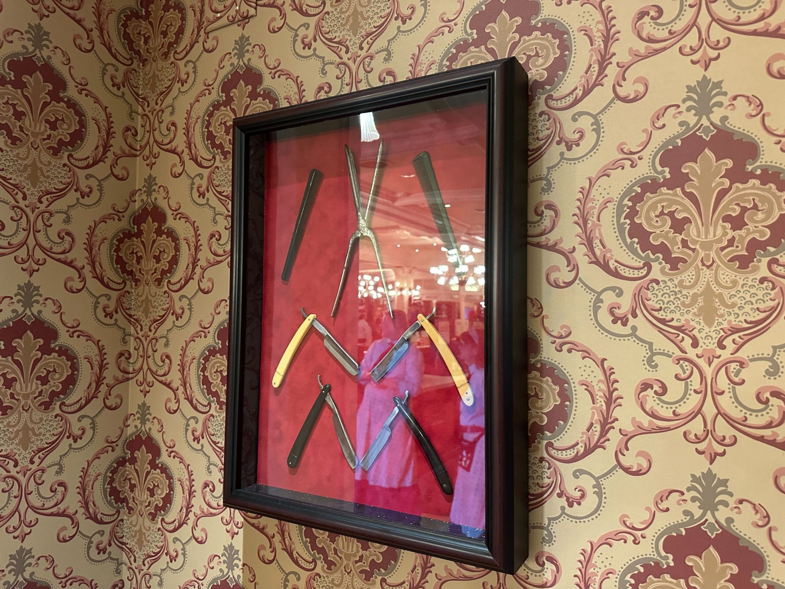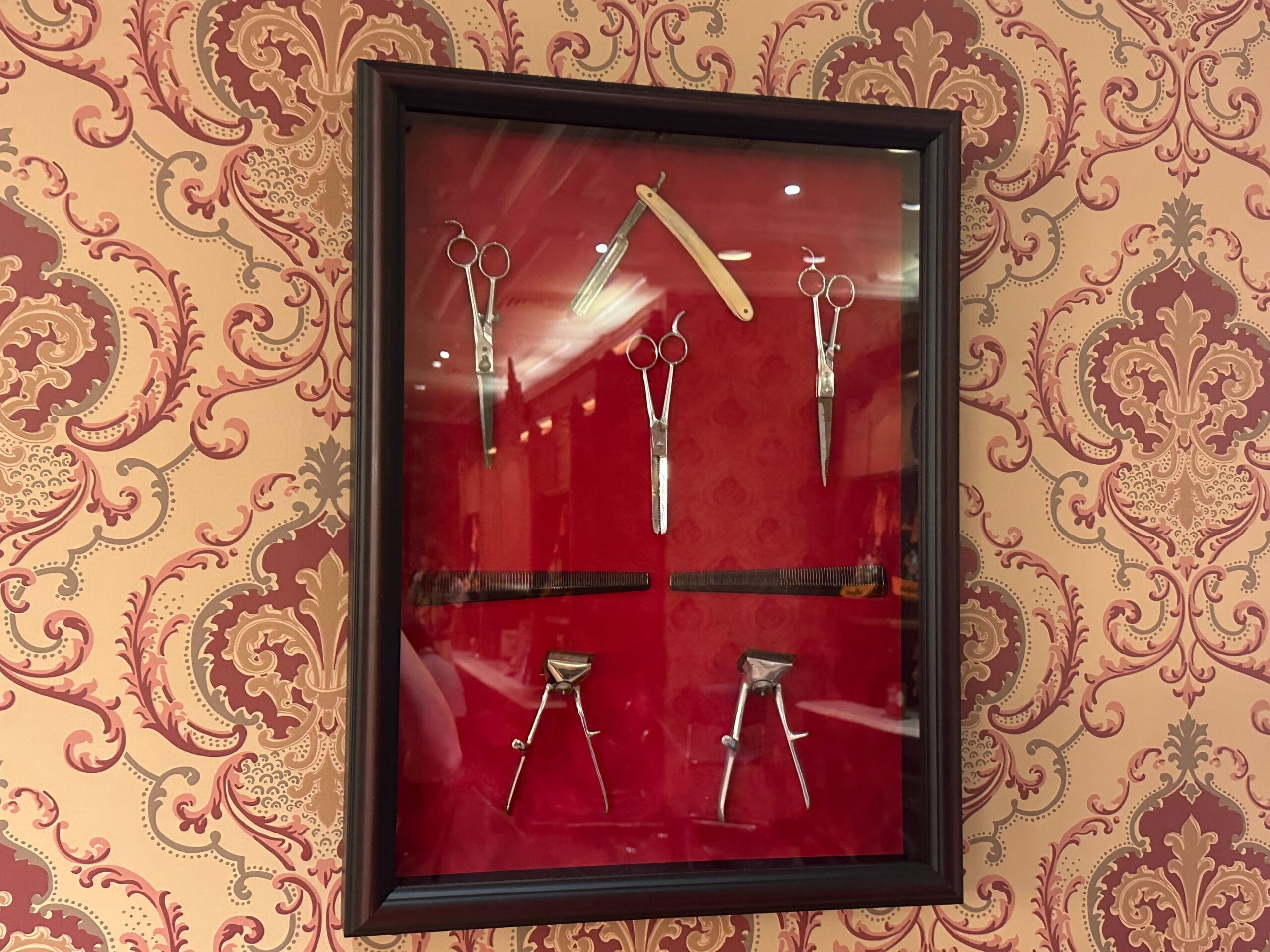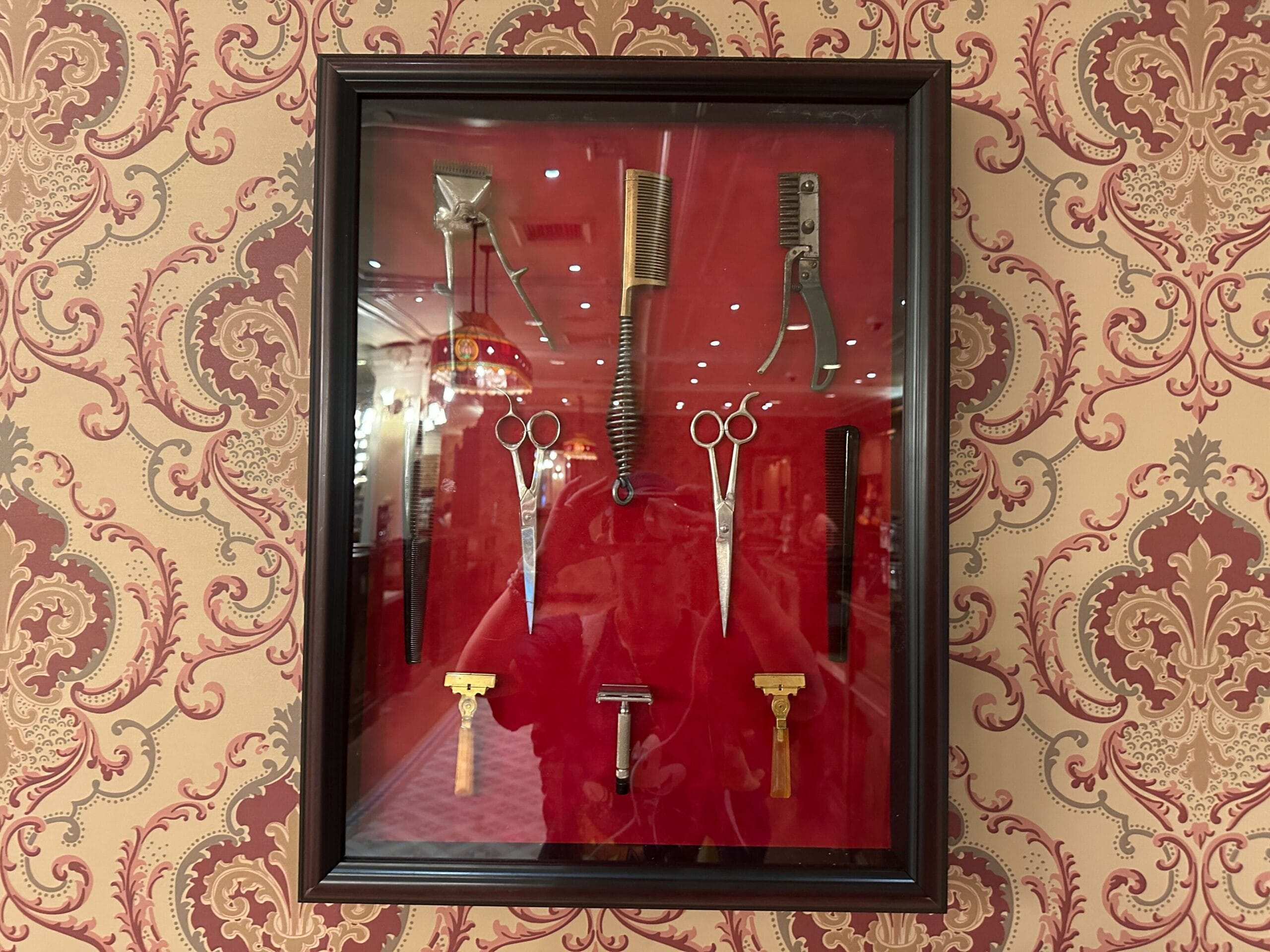 The middle shadowbox has a straight razor above three trimming scissors, then two combs laid horizontally, and finally two metal-handled clippers at the bottom.