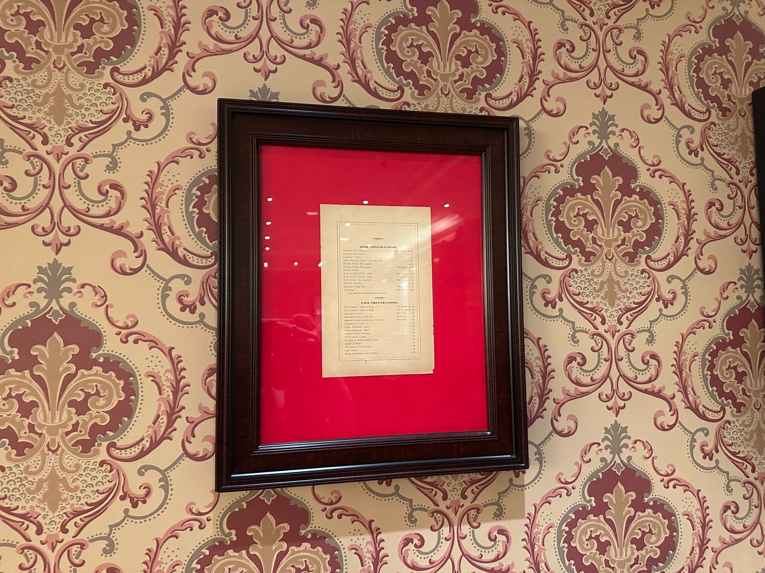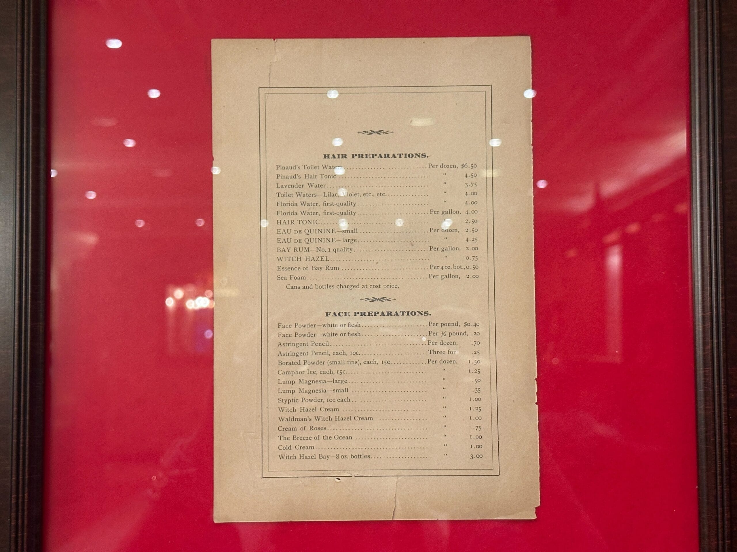 Between the middle and rightmost shadowbox is a price list for “Hair Preparations” and “Face Preparations.”