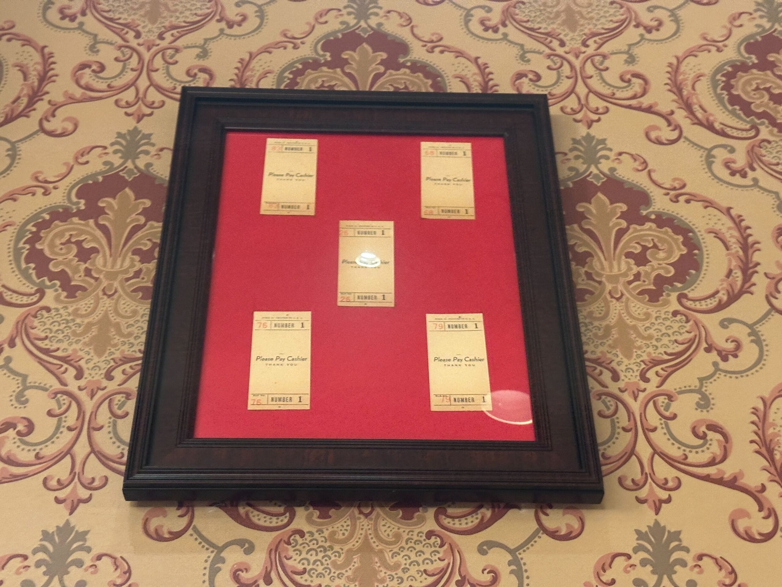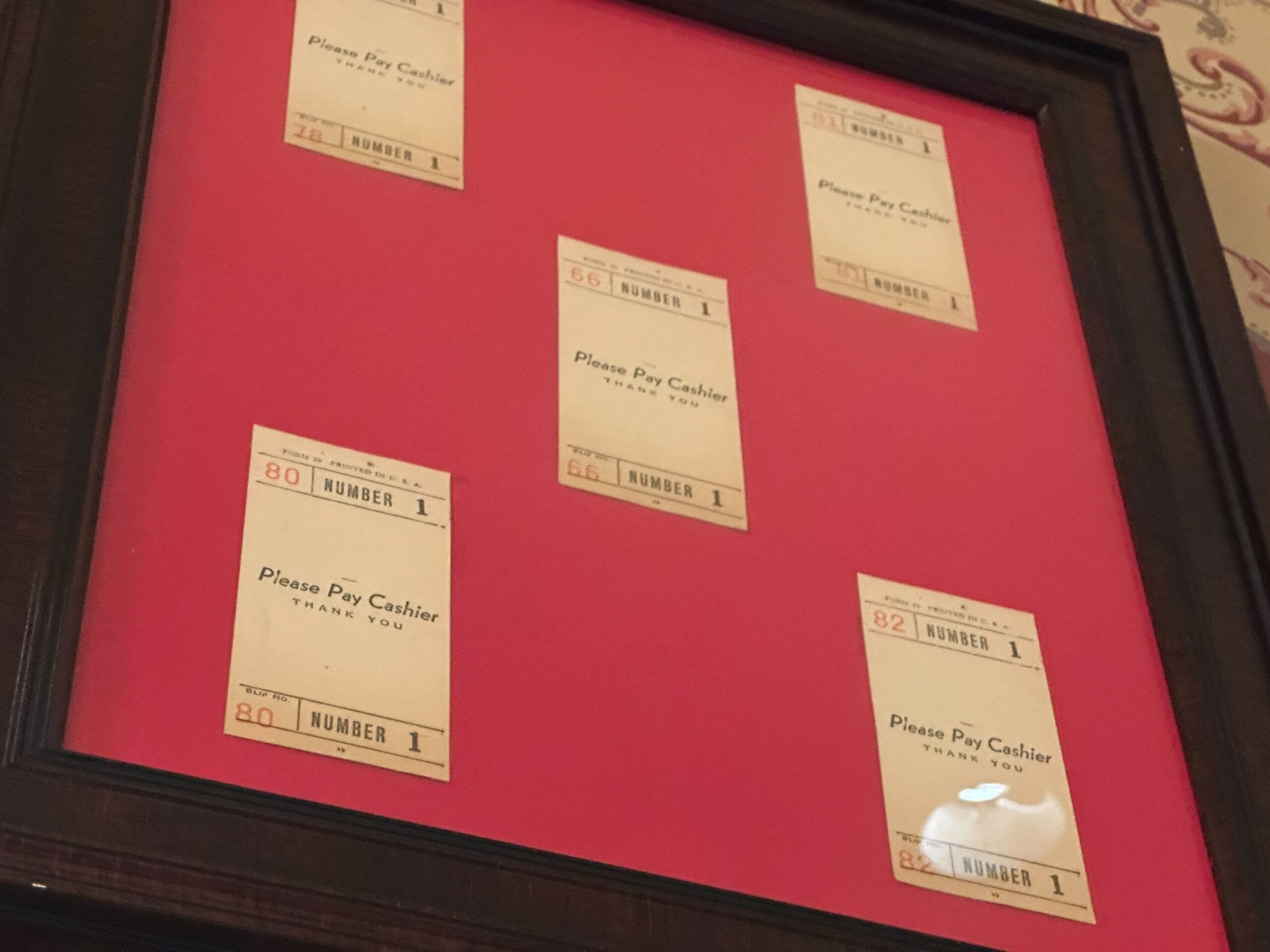 The top left frame contains five numbered barbering receipts with “Please Pay Cashier, Thank You” in the middle. A repeat of this design is also in the top right.