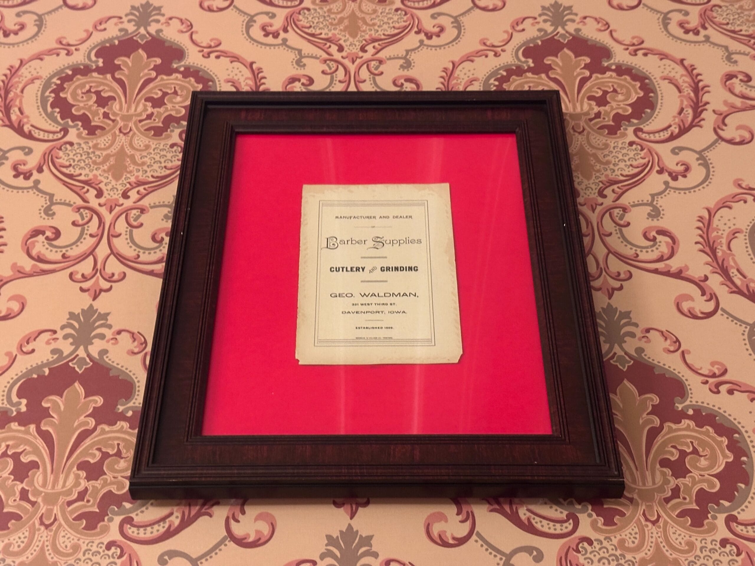 Hung above is a framed certificate proclaiming “Manufacturer and Dealer, Barber Supplies, Cutlery and Grinding, Geo. Waldman, 321 West Third St., Davenport, Iowa. Established 1869.”