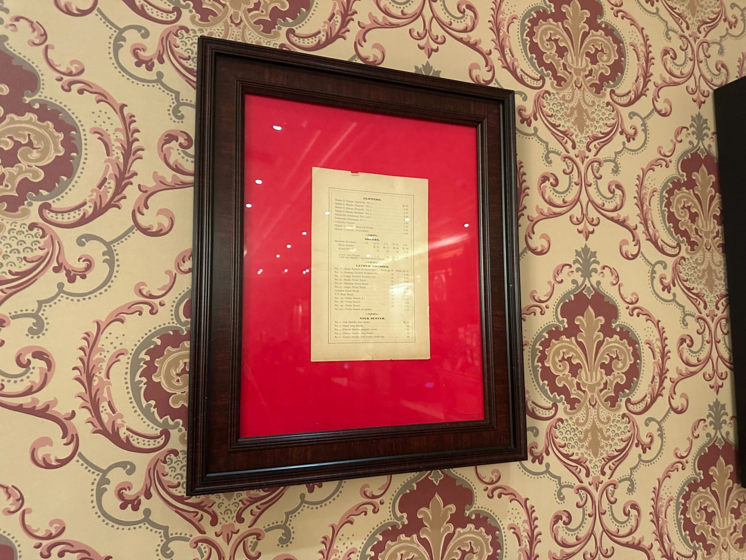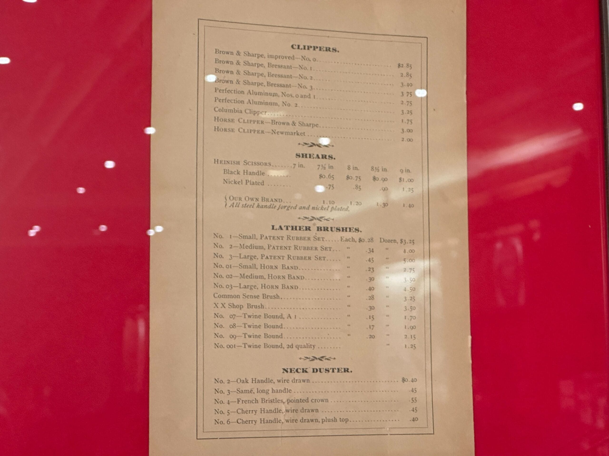 Between the shadowboxes on the bottom row are framed price lists. The left is for several types of barbering tools, with multiple varieties of clippers, shears, lather brushes, and neck dusters.