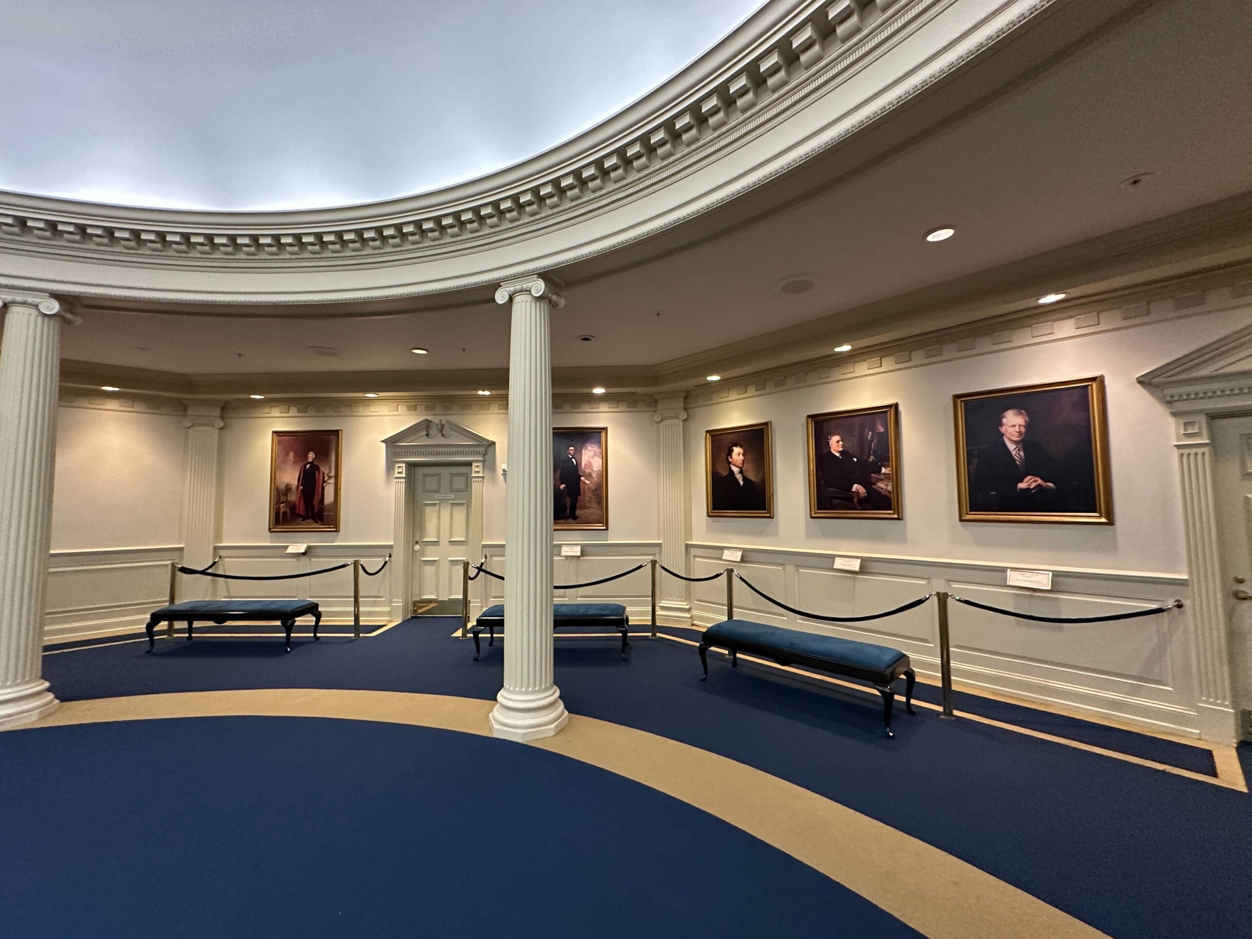 The “queue” for the attraction showcases portraits of Presidents and other exhibits with various artifacts relating to the United States.