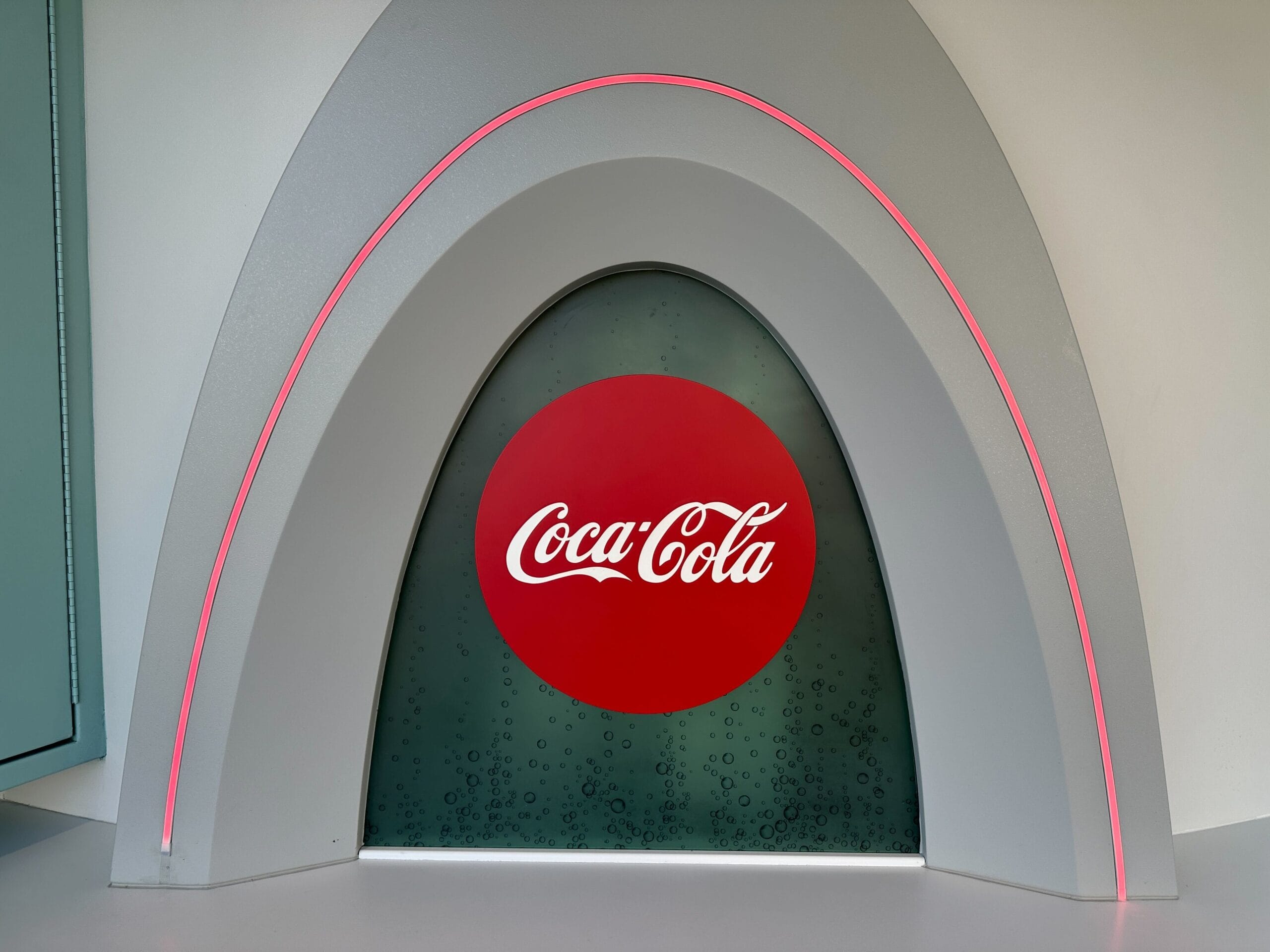 The kiosk is sponsored by Coca-Cola, with their logos on the signs and windows.