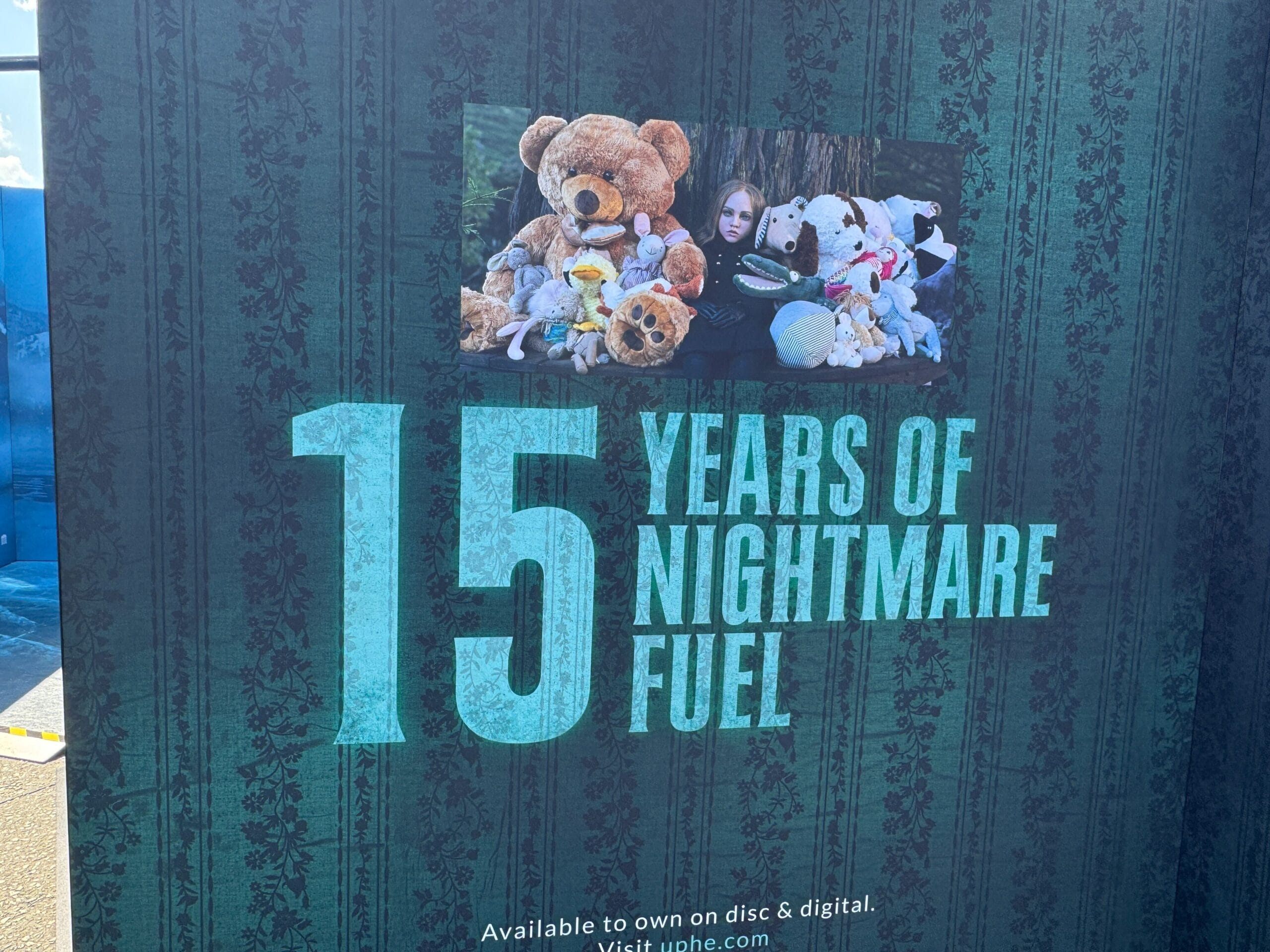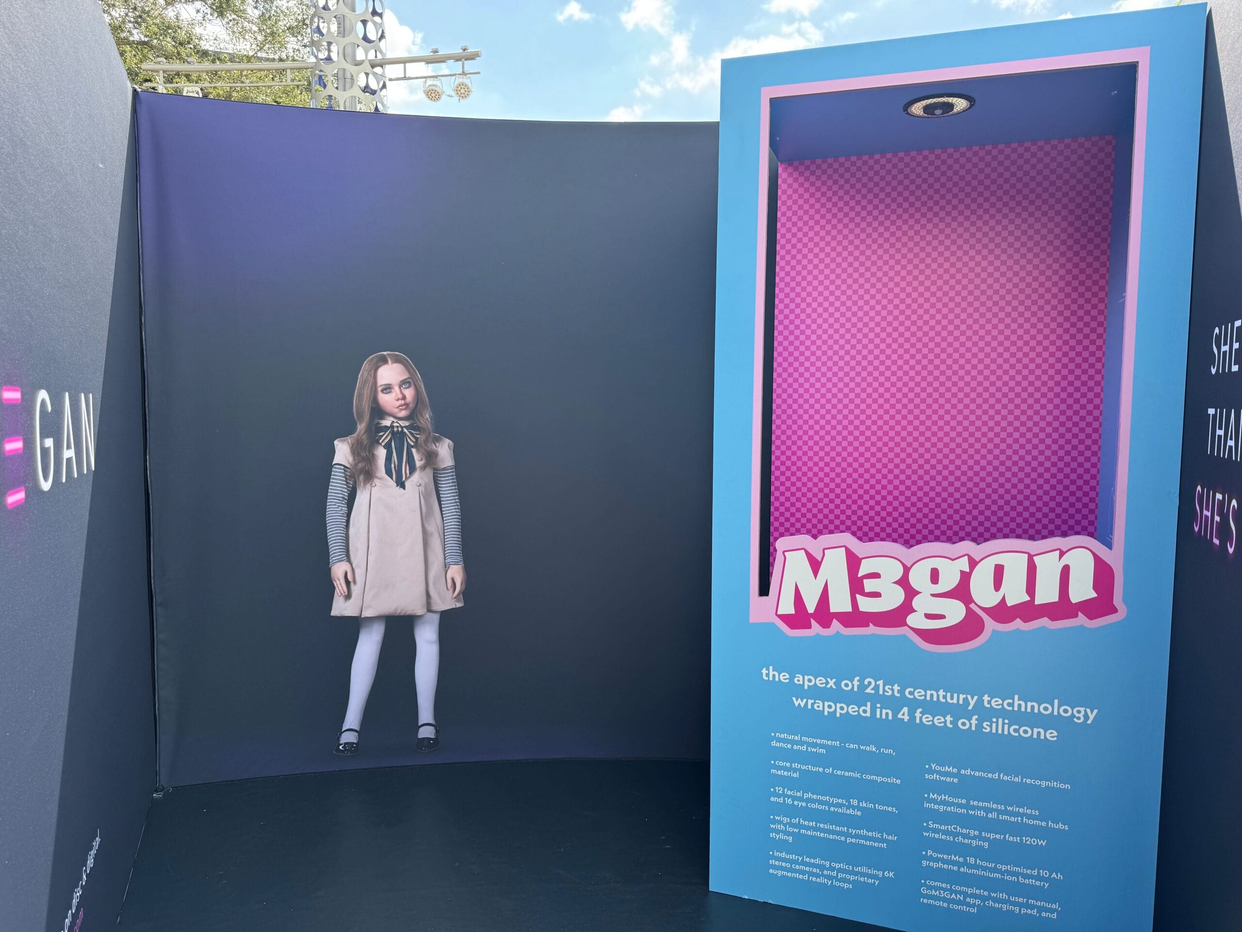 On one wall is a photo of M3GAN in a pile of stuffed toys above the text “15 Years of Nightmare Fuel.” Scenes from other Blumhouse films are on the opposite wall.