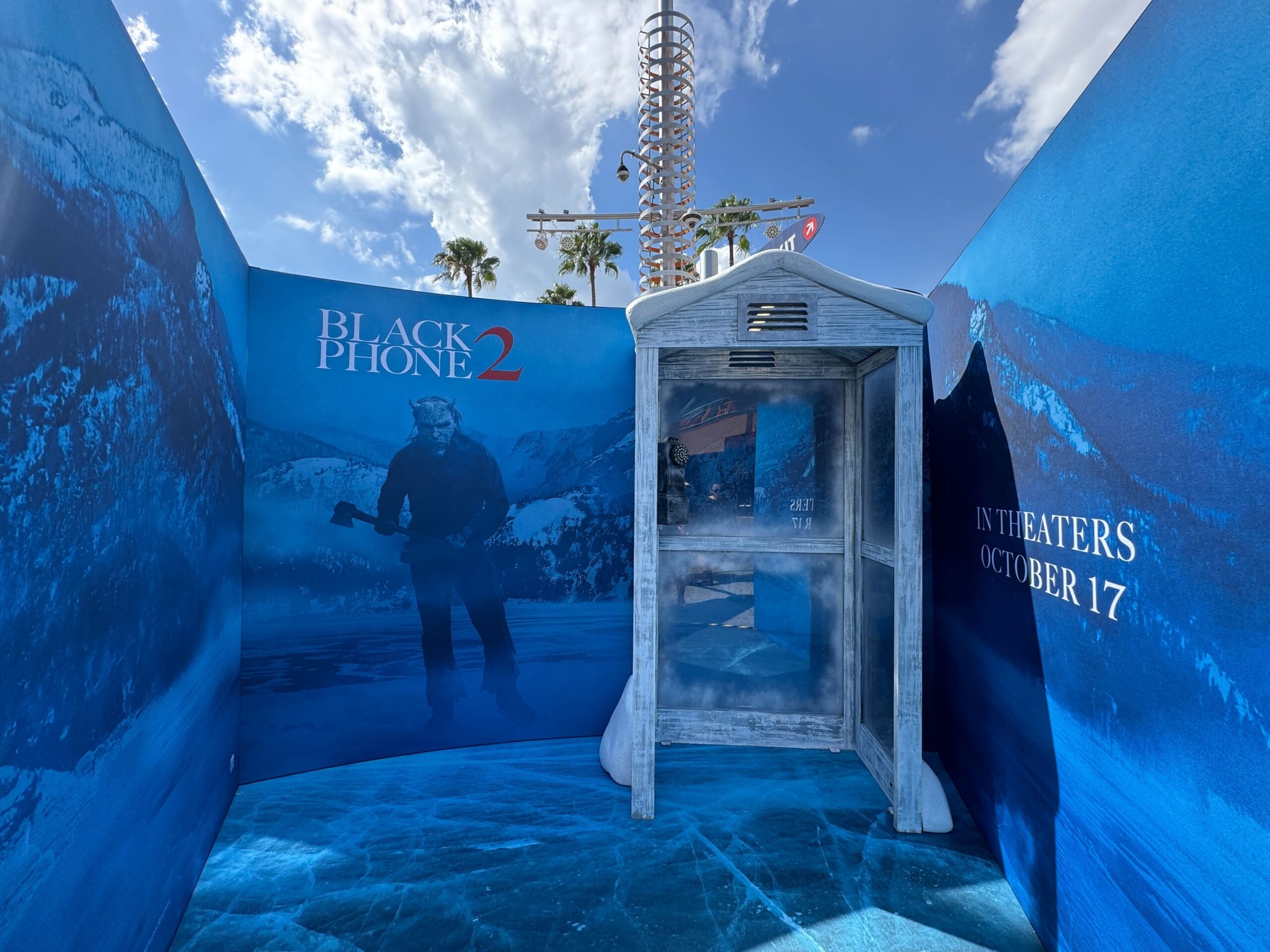 We first spotted this activation under construction a couple days ago; it’s now officially open. The photo ops are set up near the lagoon stage, with a set of trusses with stage lights overhead. The Blumhouse logo-shaped entrance is flanked by two darkly wallpapered walls with the Blumhouse 15 logo.