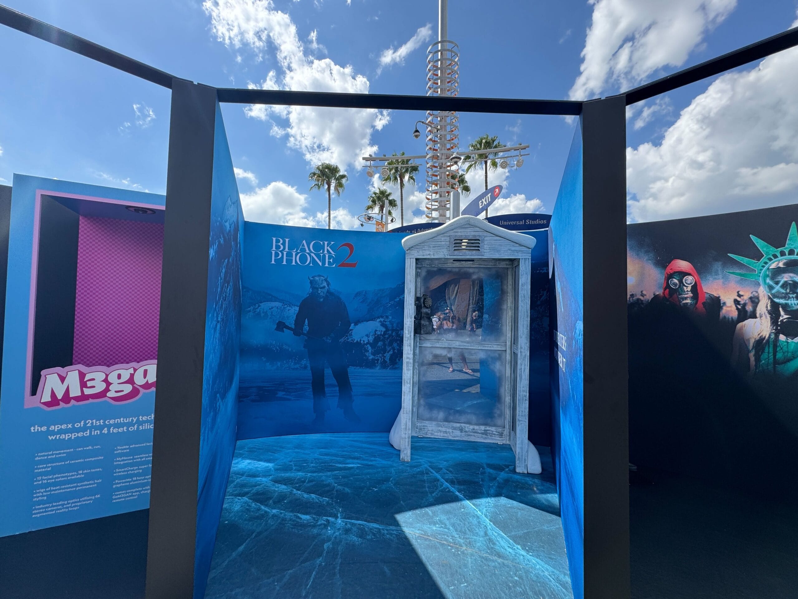 Beyond are four themed areas: a generic Blumhouse set, Black Phone 2, The Purge, and M3GAN.