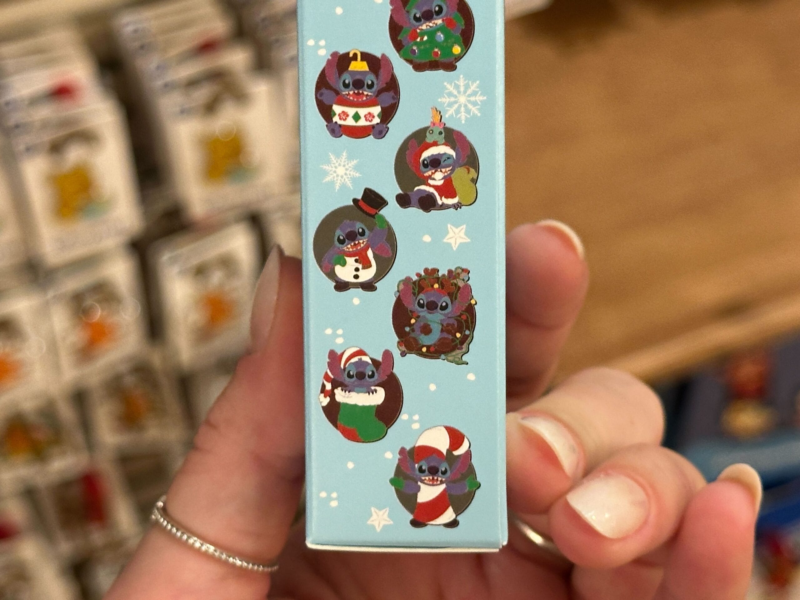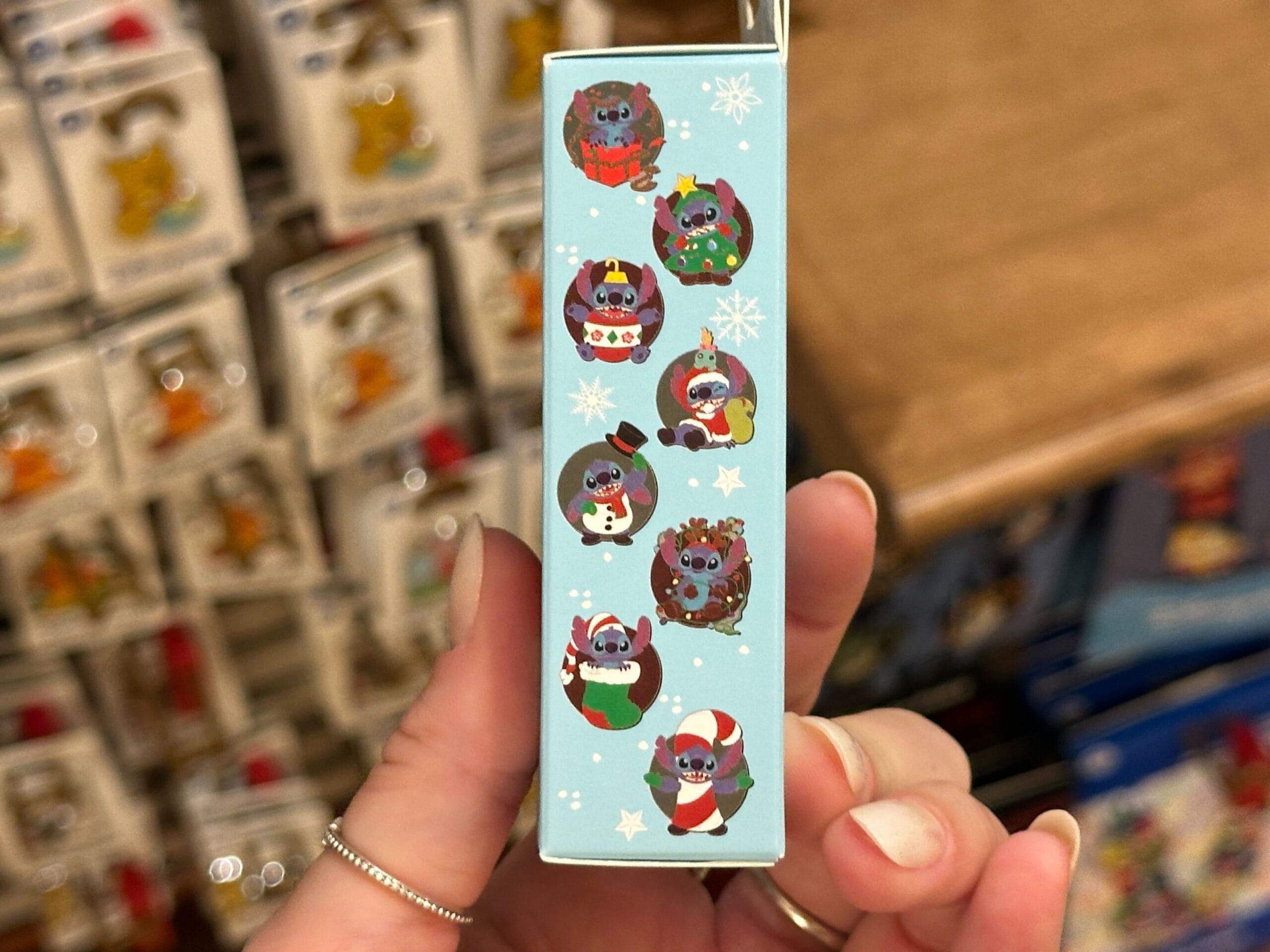 The Merry Stitchmas Mystery Pin Set comes in a blue box with Stitch on the front sitting in a gift box. Each pin features Stitch getting into various Christmas mischief, like dressed as a snowman, Christmas tree, candy cane, or ornament. Other pins show Stitch sitting in a stocking and being wrapped in strands of lights.