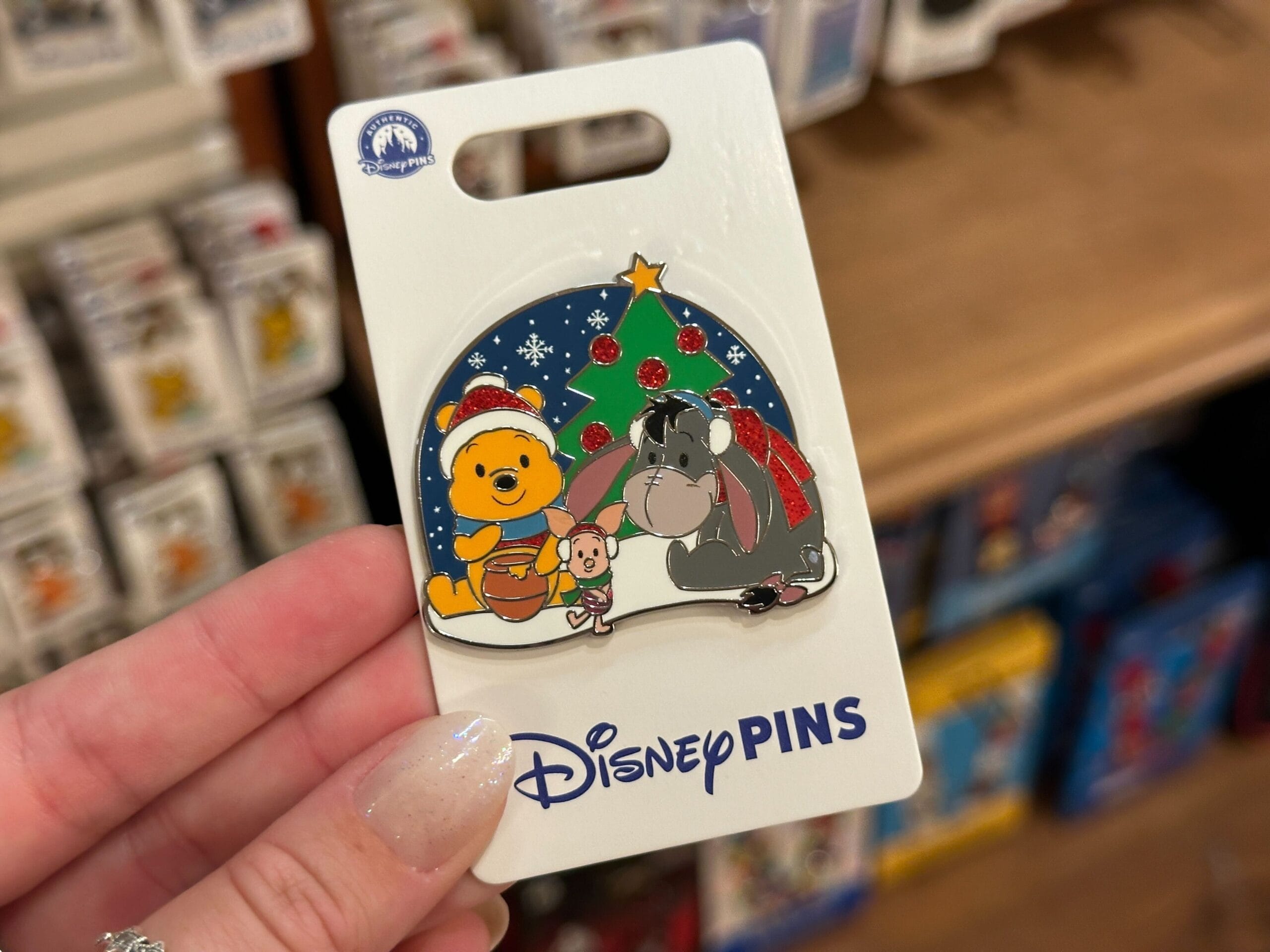 The Winnie the Pooh Pin shows a snowy scene with Pooh, Piglet, and Eeyore in their winter gear. They are placed in front of a Christmas tree with red ornaments and a star on top. Pooh wears a Santa hat and scarf as he holds a pot of hunny.