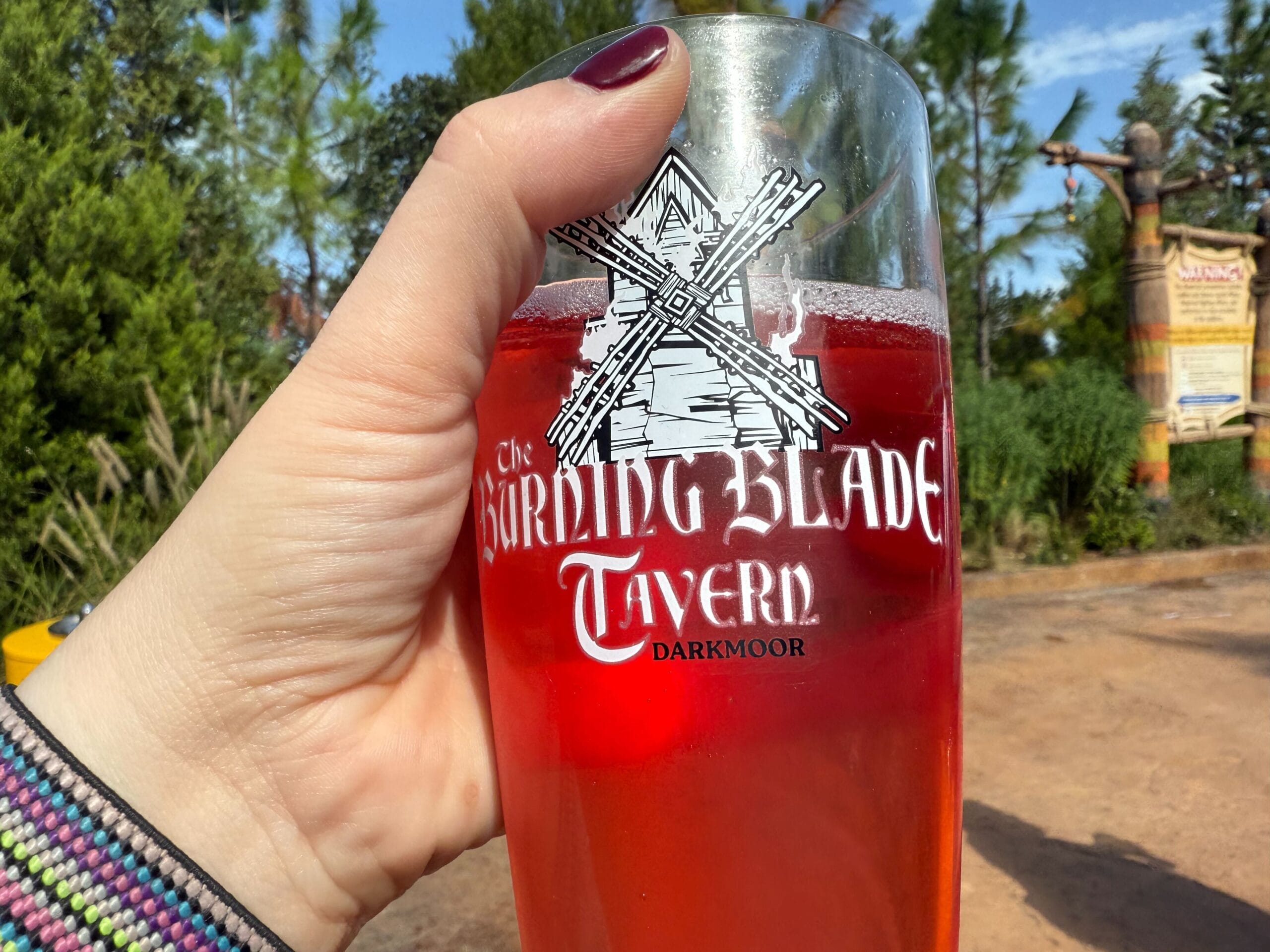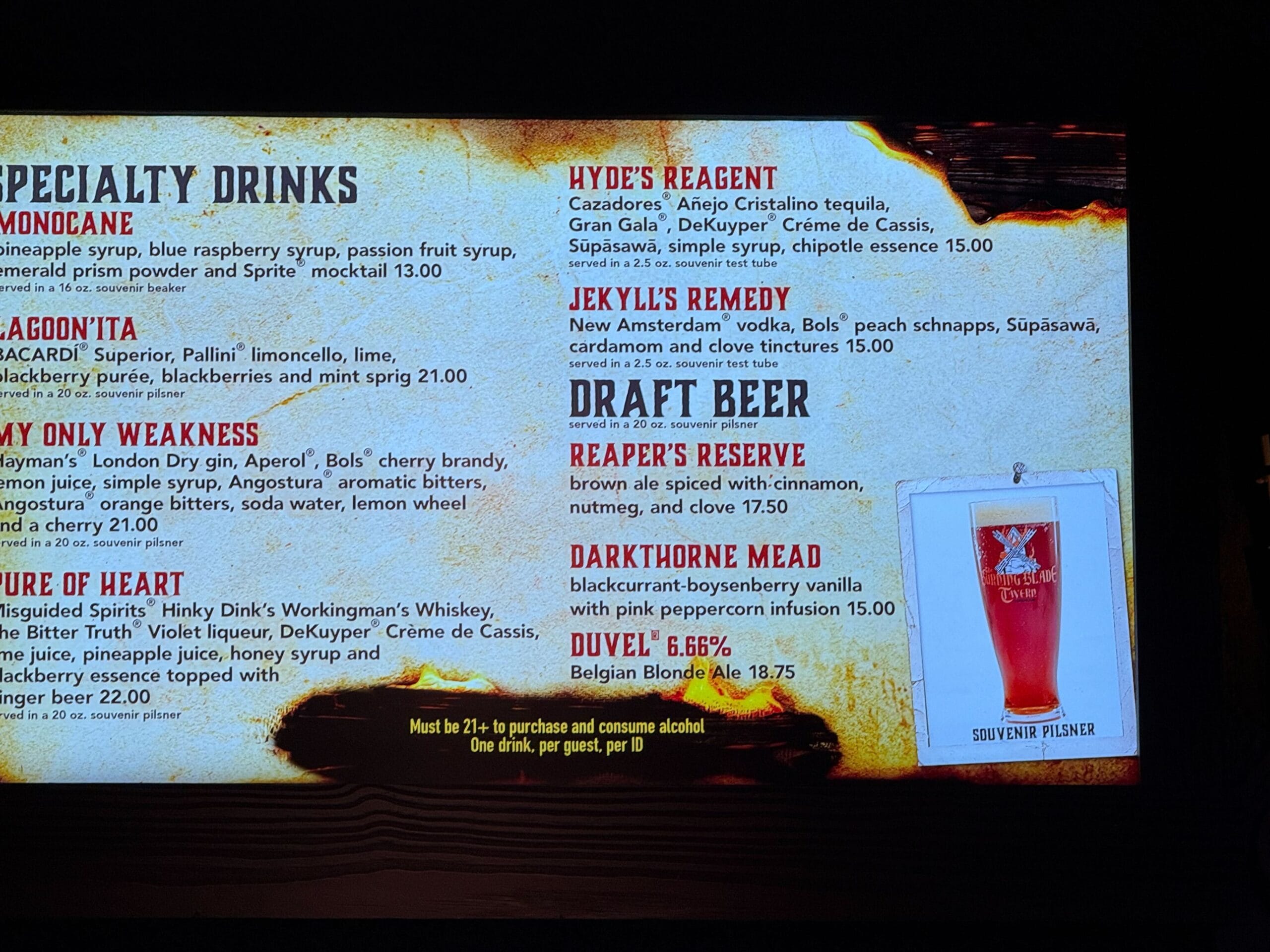 As one would expect, you can pick up this glass with a variety of alcoholic libations at The Burning Blade Tavern through the Dark Universe portal in Epic Universe.
