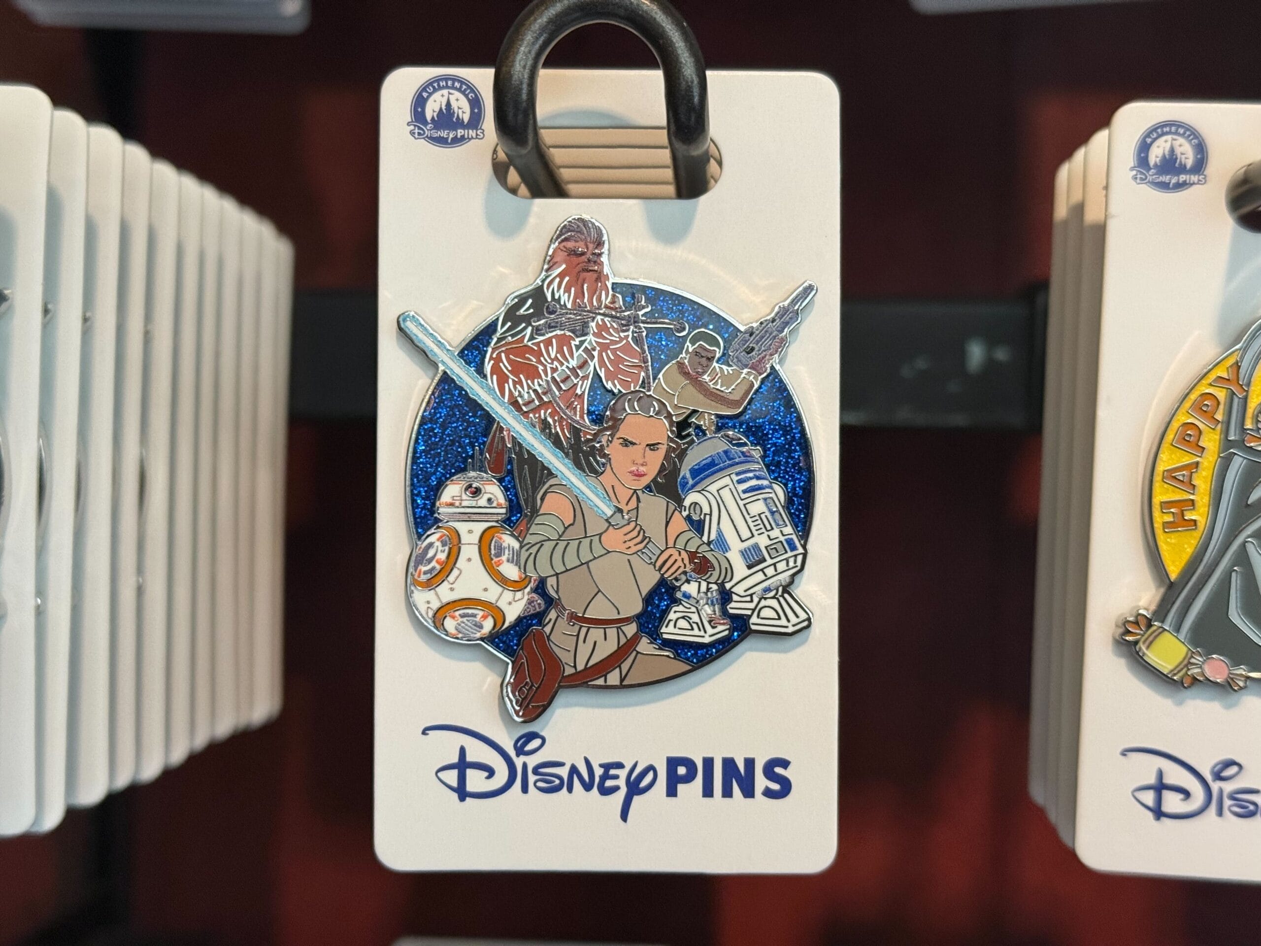 The circular pin features Rey, Chewbacca, R2-D2, BB-8, and Finn from the Skywalker saga of the Star Wars franchise. The background is blue and sparkly.