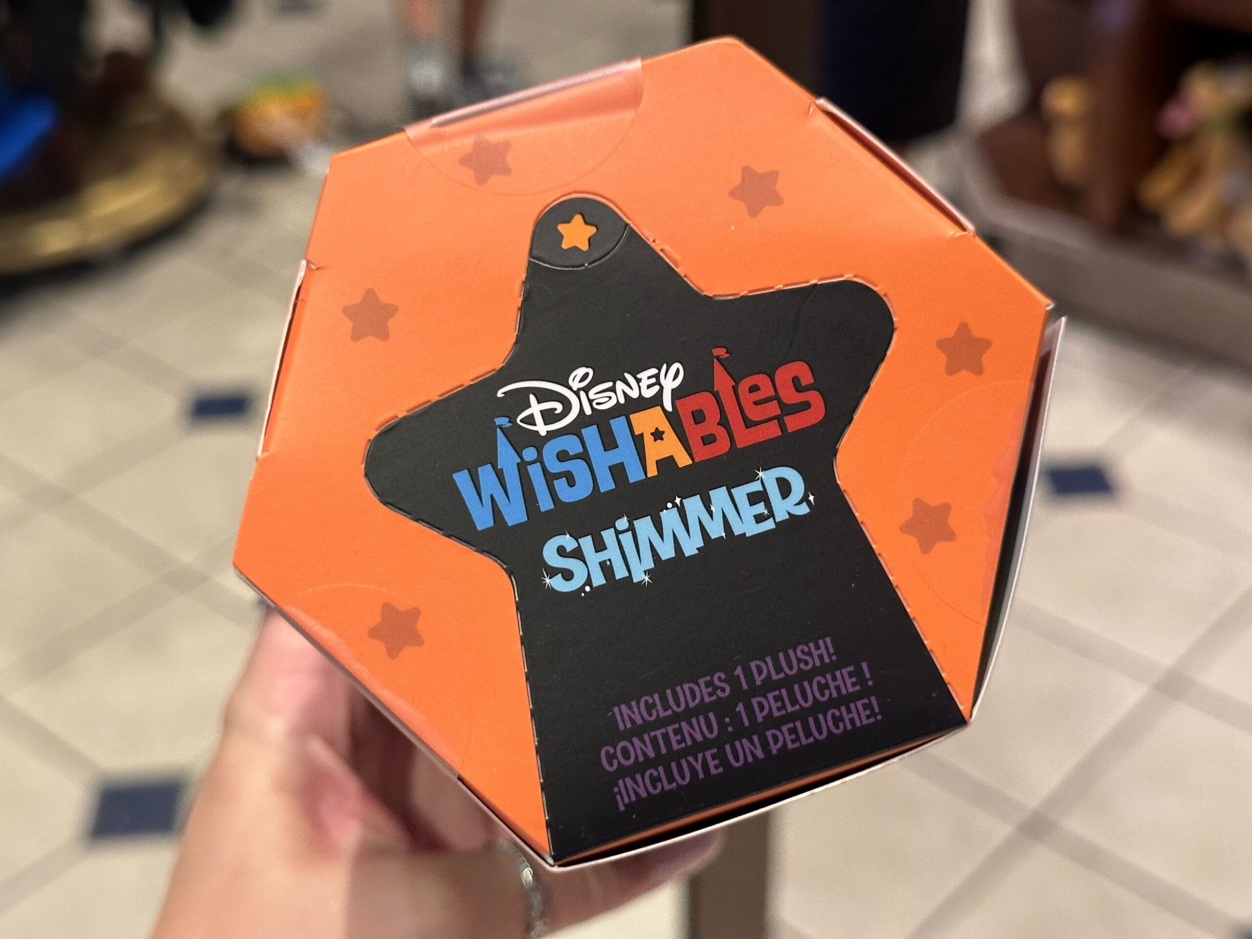 The top of the packaging, which is shaped to prevent guests from trying to guess which character is inside the box, is orange with a black star. It reads “Disney Wishables Shimmer” and has perforated lines where guests can open their box after purchasing it.