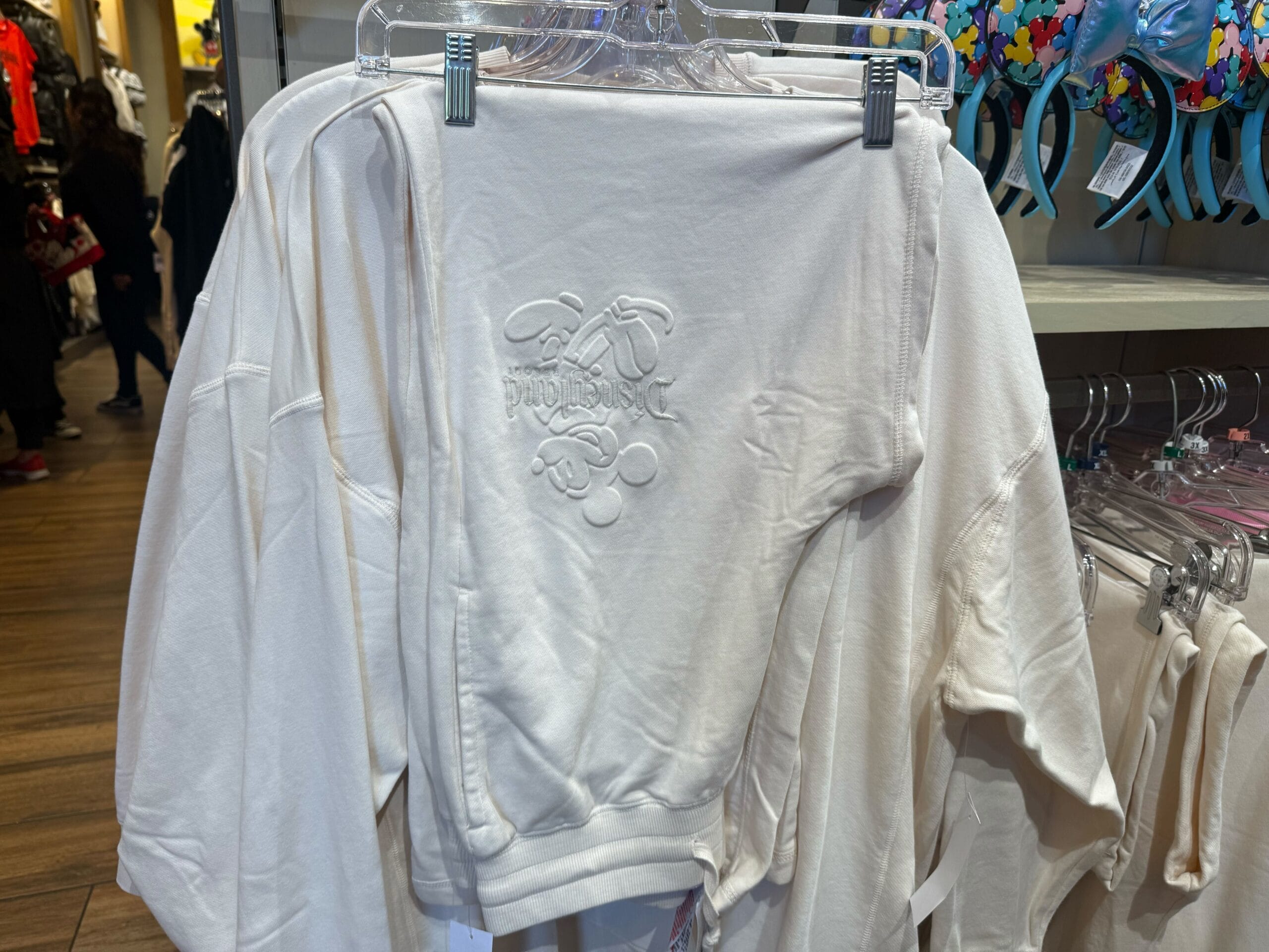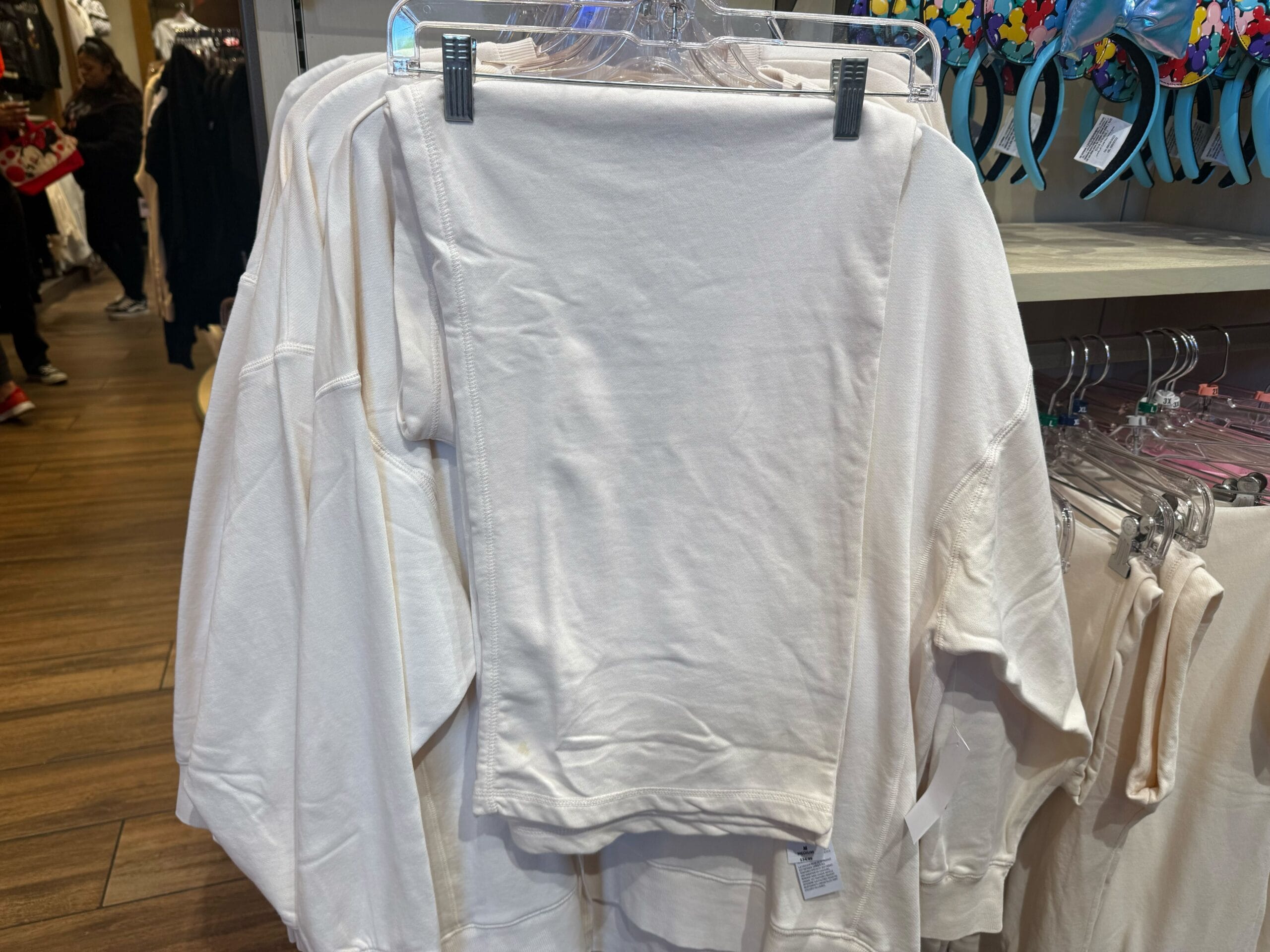 Stay warm and cozy with a new white sweatshirt and matching sweatpants featuring Mickey Mouse.