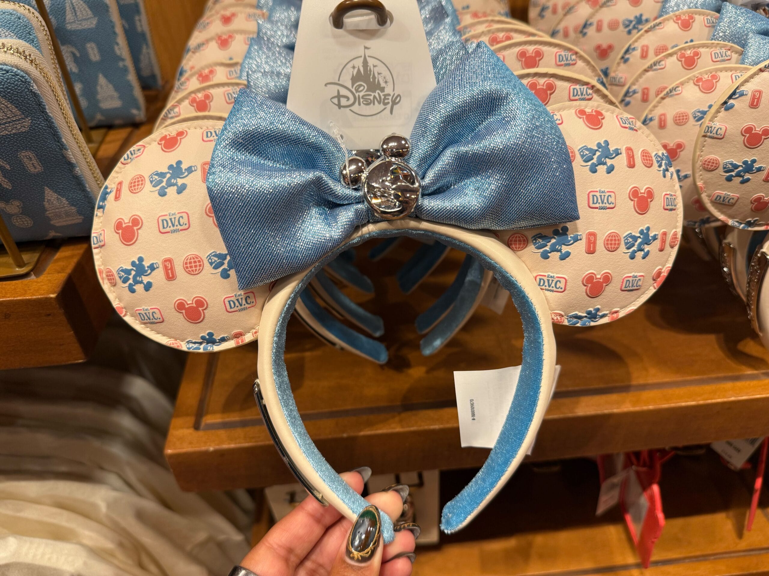 The mouse ears and headband are made of padded white pleather. The ears are patterned with embossed reddish-pink and blue DVC icons, including Mickey head icons, Mickey’s silhouette with luggage, a globe, and ’91 logos for the founding year of Disney Vacation Club. The pattern is also seen on the back of the ears.
