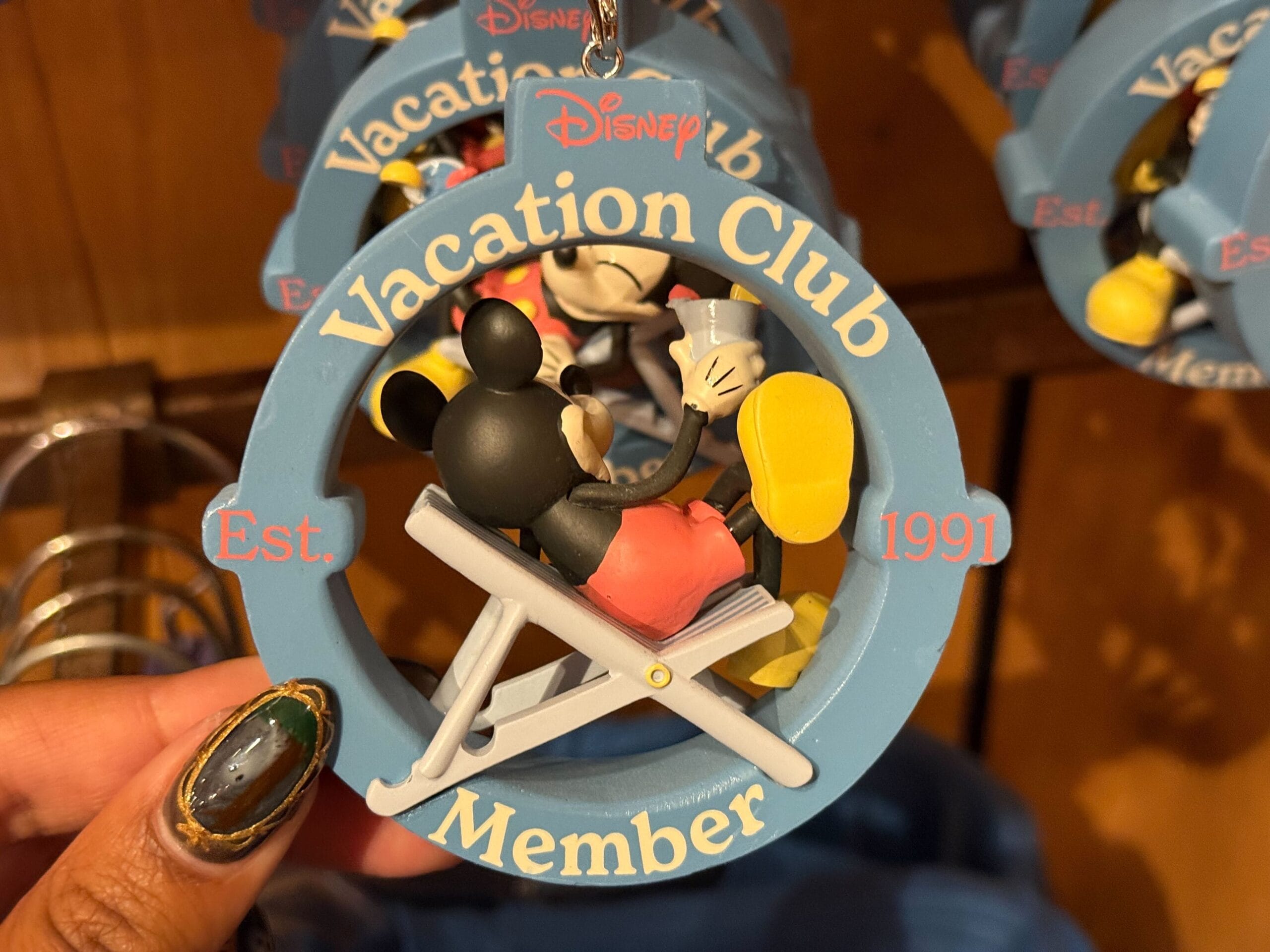 The relaxing Mickey art is rendered in three dimensions for this ornament. A circular blue frame printed with “Disney Vacation Club Member” and “Est. 1991” encompass the mouse. who is lounging on his beach chair and enjoying a drink.