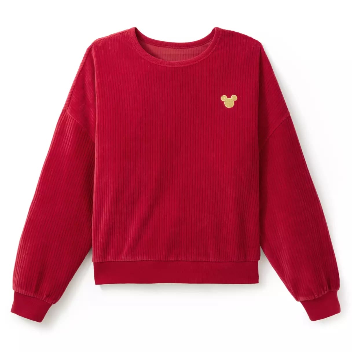 This is a cream-colored ribbed corduroy pullover with a slit hem, long sleeves, drop shoulders, and crew neck. An embroidered gold Mickey icon is on the chest. It’s 65% cotton / 32% polyester / 3% spandex.