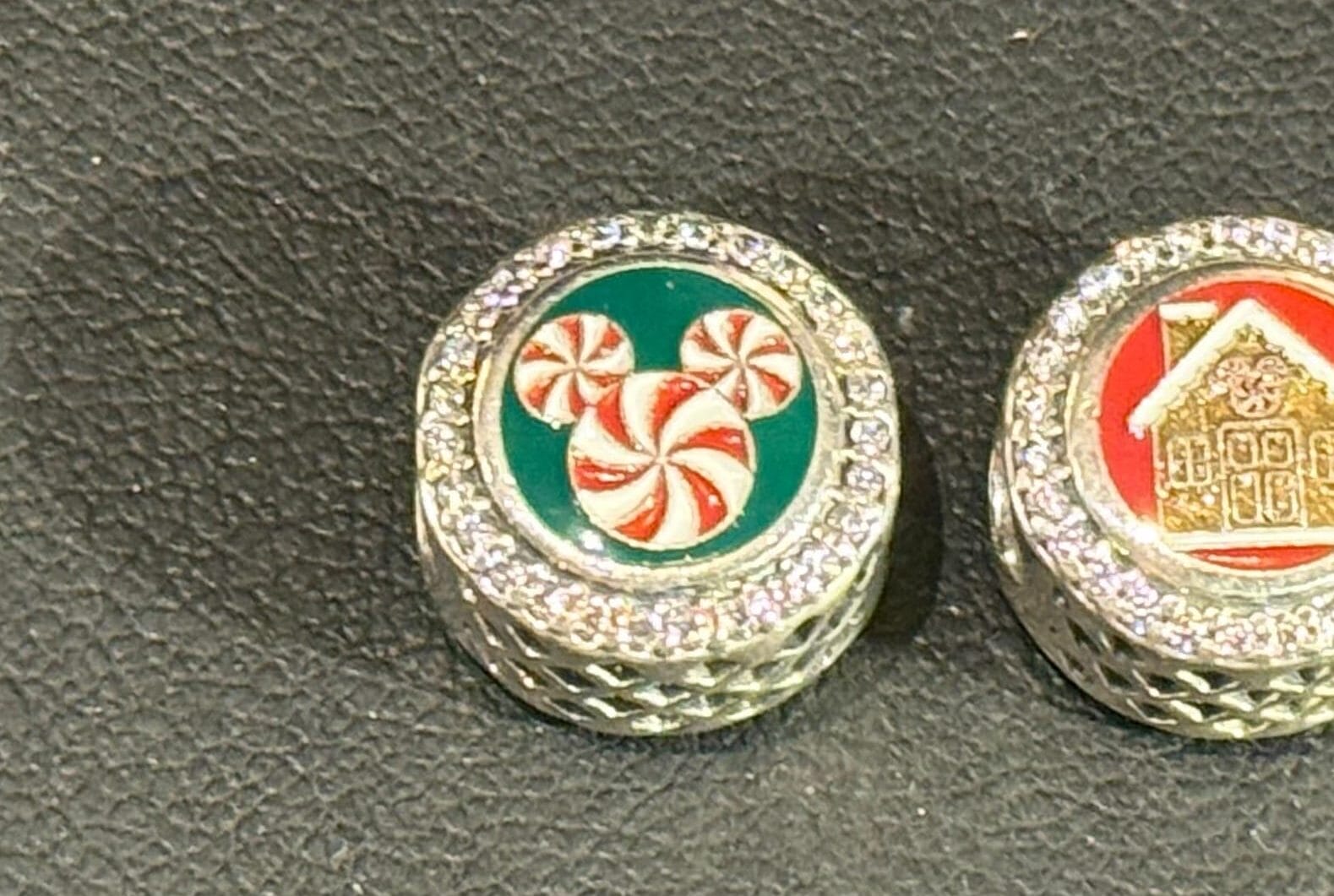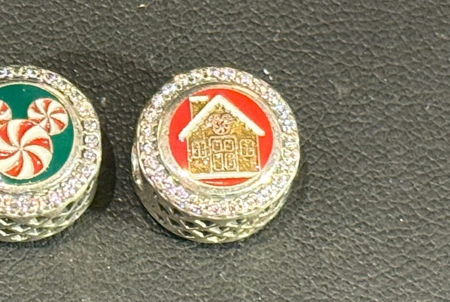 Each side of the holiday charm has a different enamel design. One side is a red background with a gingerbread house. Above the door is a a peppermint Mickey head decoration.