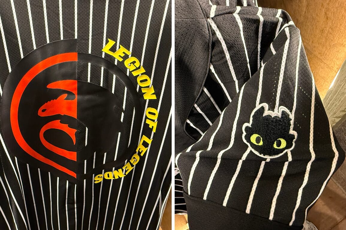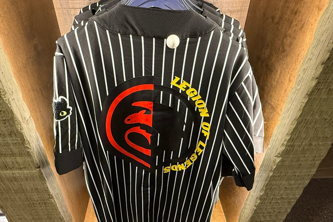 The back of the jersey features a red and black split color Toothless emblem in the center with “LEGION OF LEGENDS” in yellow along the right side of the image.