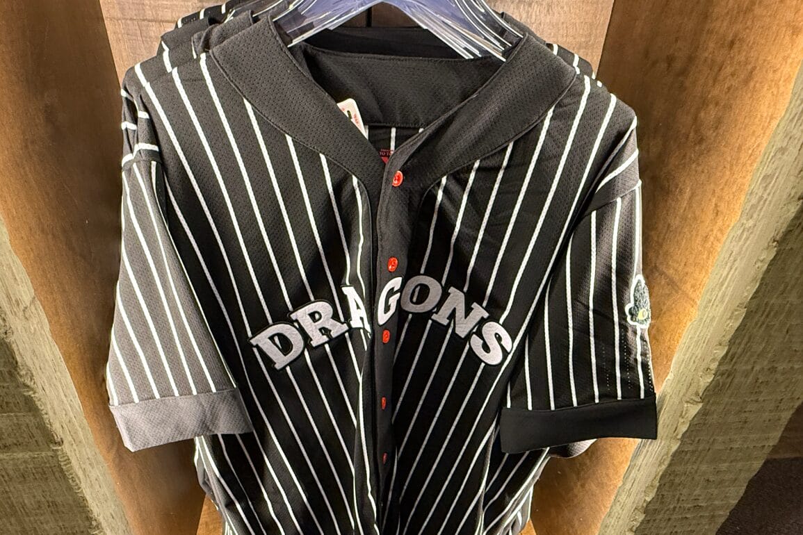 With bright white patches that spell out “DRAGONS” on the front, this baseball jersey is ready for game day. It is a black and white striped jersey with solid black sleeve cuffs and red buttons going down the front.