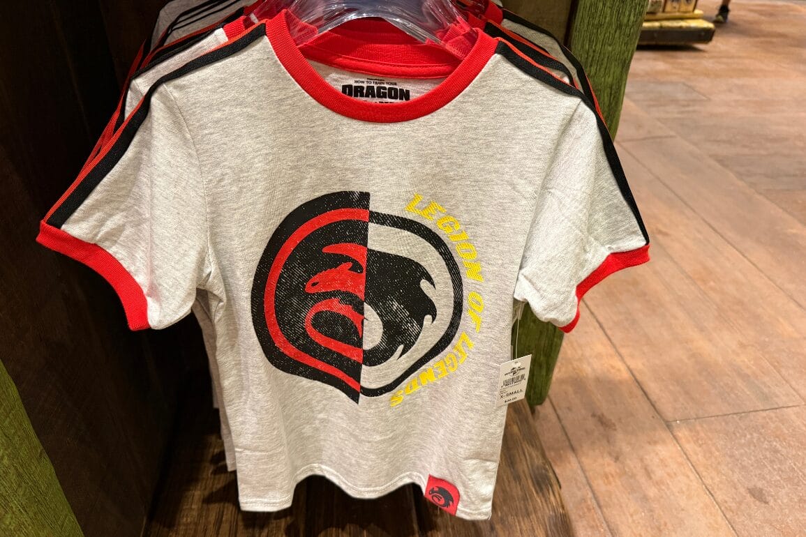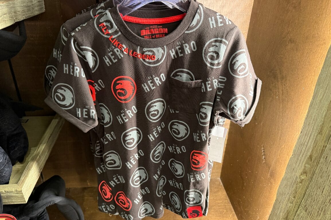 Also featuring the same “BE A HERO” text as the grey Toothless sweatshirt is this black youth T-shirt. Along with the saying in grey text is the Toothless emblem, displayed in either grey or bright red. The front of the shirt also has a lapel pocket and the phrase “FLY LIKE A LEGEND” in red on the right-hand side along the collar. The back of the shirt features the same pattern as the front, along with cuffed shirt sleeves.