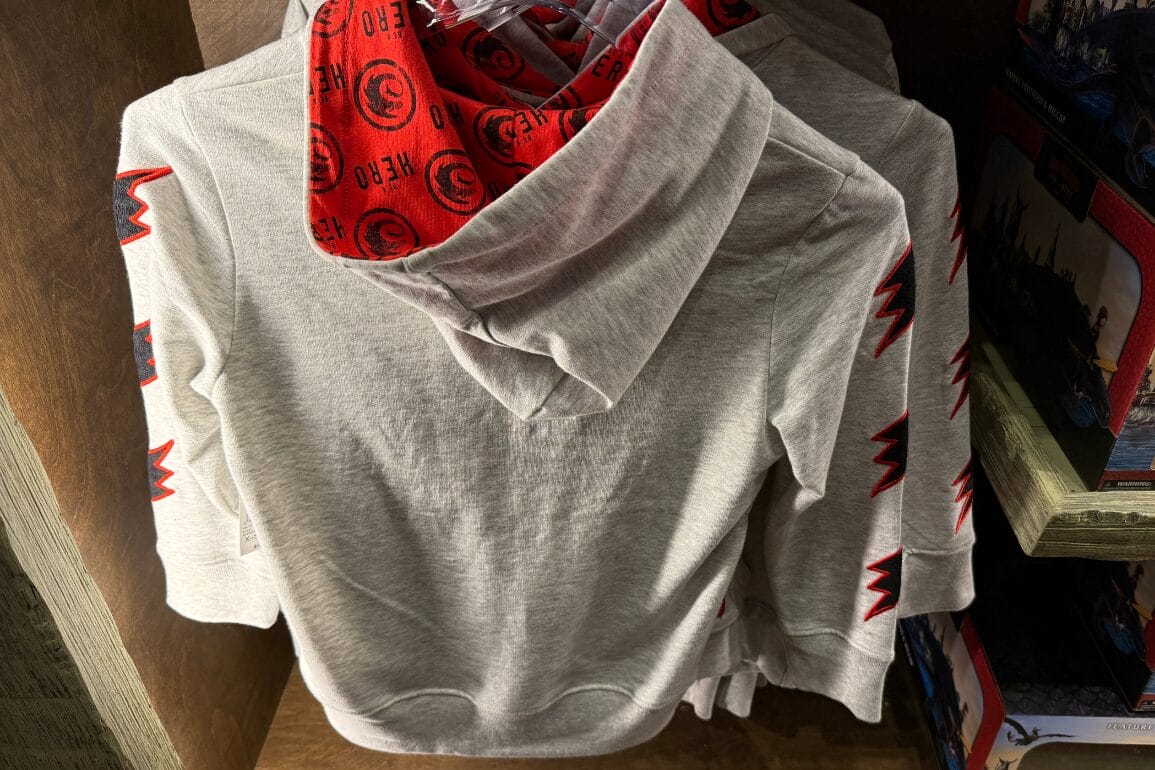 The back of the sweatshirt is blank with three lightning bolt symbols on each sleeve. The symbols are black with red outlines. Inside the hood is a bright red fabric with black stamps of the Toothless emblem. The words “BE A HERO” are also stamped throughout the inside of the hood.