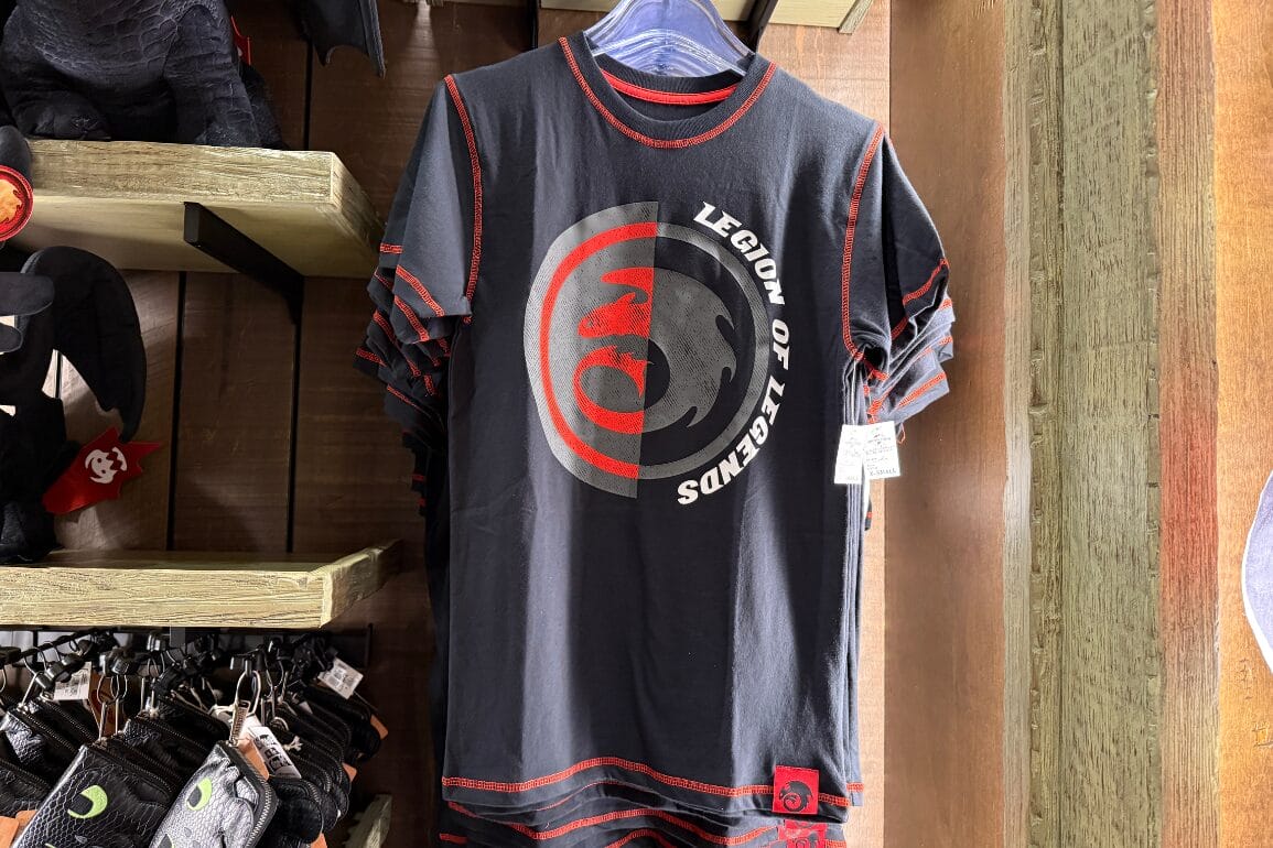 This adult-sized black T-shirt is highlighted with red threading around the hem, collar, and sleeves. On the front is a print of the split-color Toothless emblem in red and dark gray. “LEGION OF LEGENDS” is in white text along the left-hand side of the emblem.