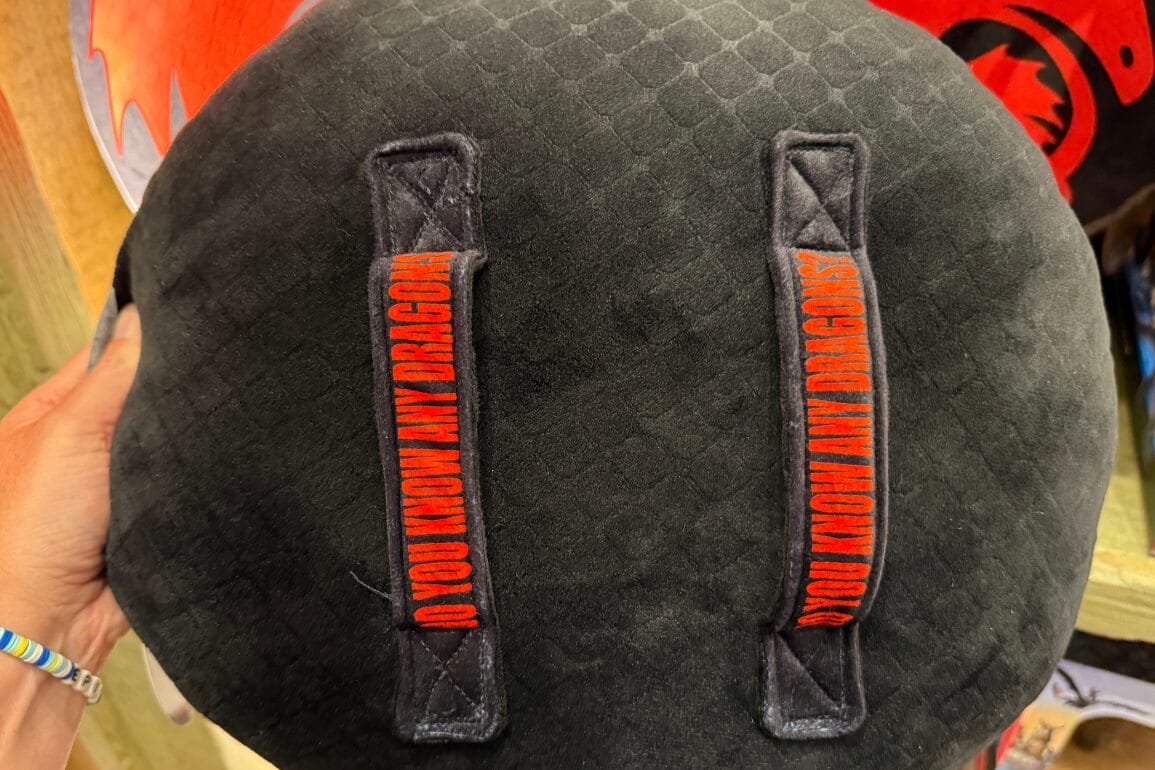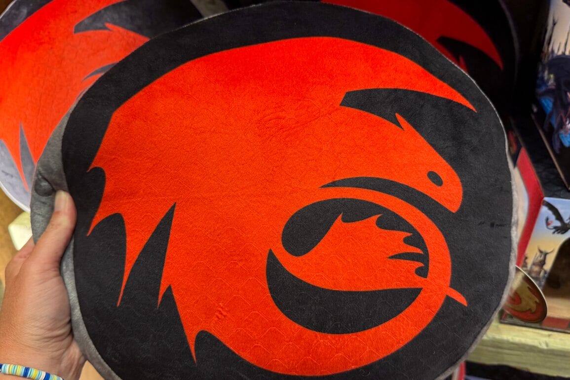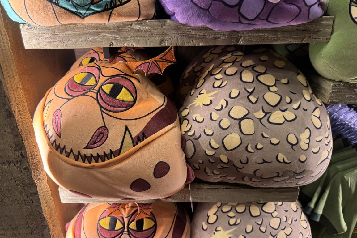The next collection of items are all reversible pillows. One side looks like a dragon’s face, while the other side is a patterned egg. This first one is themed to Toothless, so one side is his black scales with yellow eyes. and the other side is a black egg patterned with pale green lightning bolts.