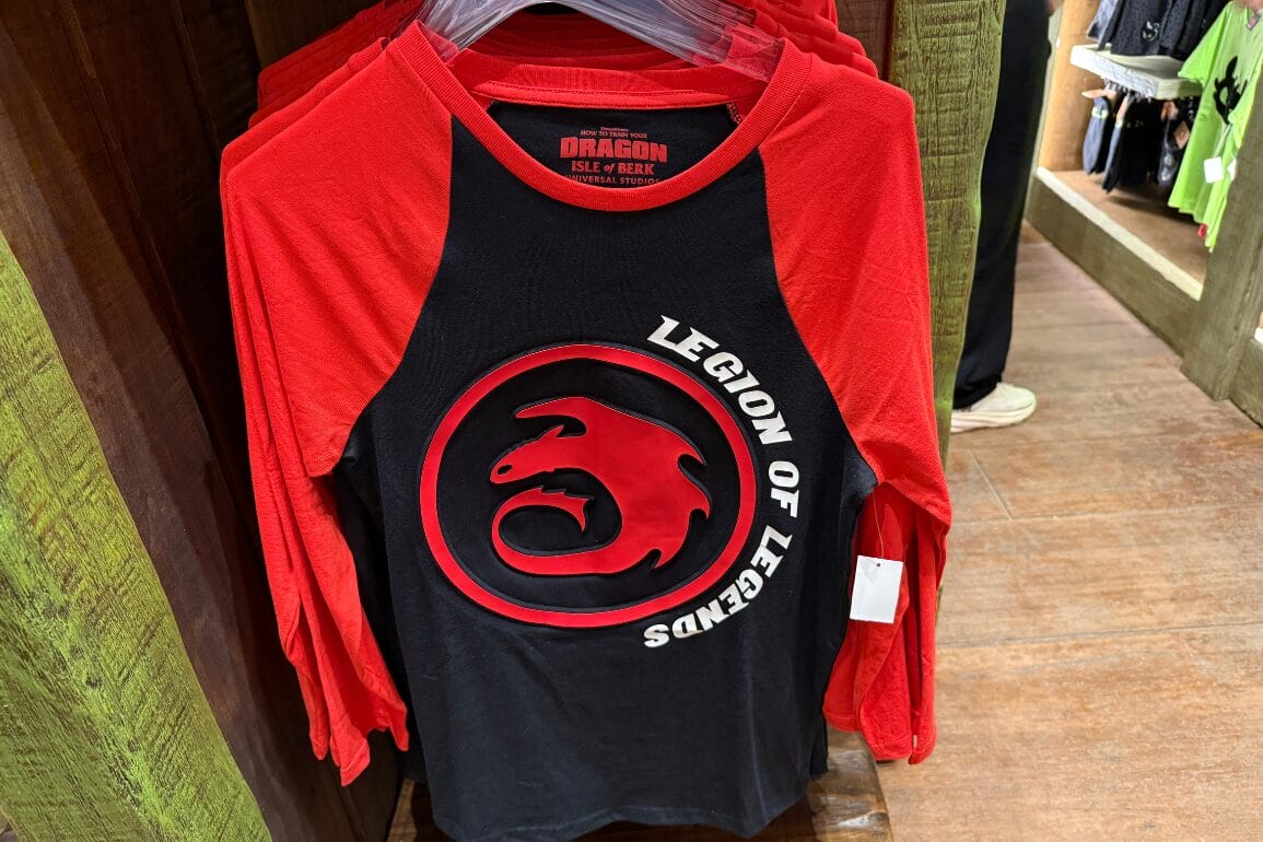 A vibrant red Toothless emblem matches the fiery red sleeves and collar of this adult raglan-style tee. The torso of the shirt is black, with a bright white “LEGION OF LEGENDS” running down the left-hand curve of the central emblem.