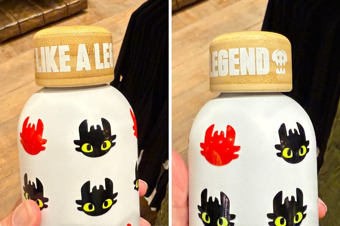 The wooden water bottle top has the phrase “LIKE A LEGEND” on it in white in all capital letters, as well as the Toothless emblem at the end.