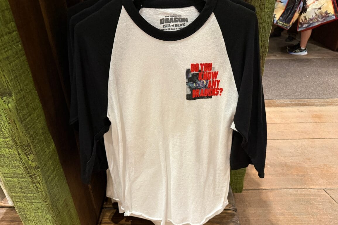 This adult raglan-style tee includes black sleeves and collar with a white torso. On the left side of the chest is an image of Toothless and the phrase “DO YOU KNOW ANY DRAGONS?” in bright red letters.