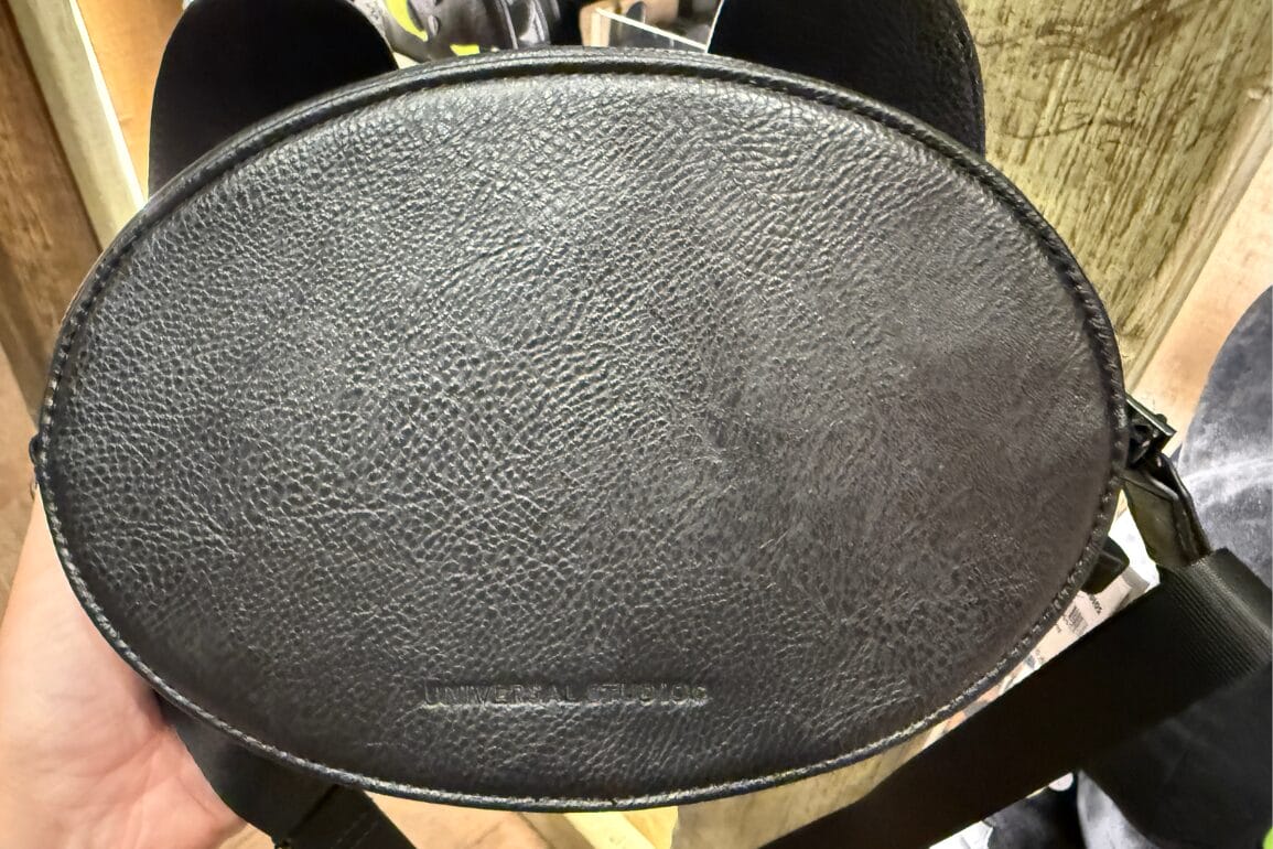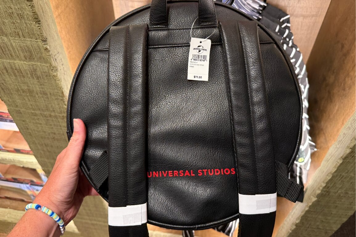 The back of the backpack is largely plain black leather, except for the red “UNIVERSAL STUDIOS” lettering printed near the bottom of the bag. Both straps are adjustable and have a cushioned underside.