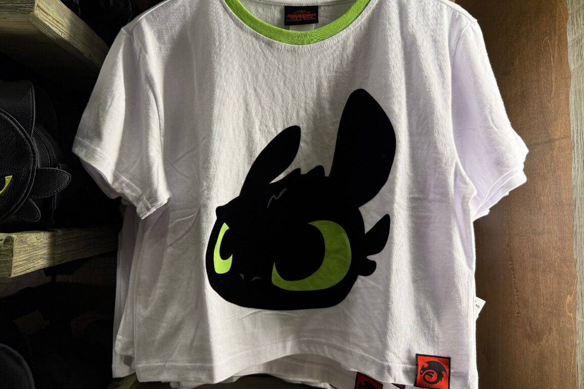 With a light green collar to match Toothless’ eyes, this white, cropped T-shirt pops. In adult size, this shirt features a cutesy image of Toothless’ black face in the center, with his bright green eyes looking to the right.
