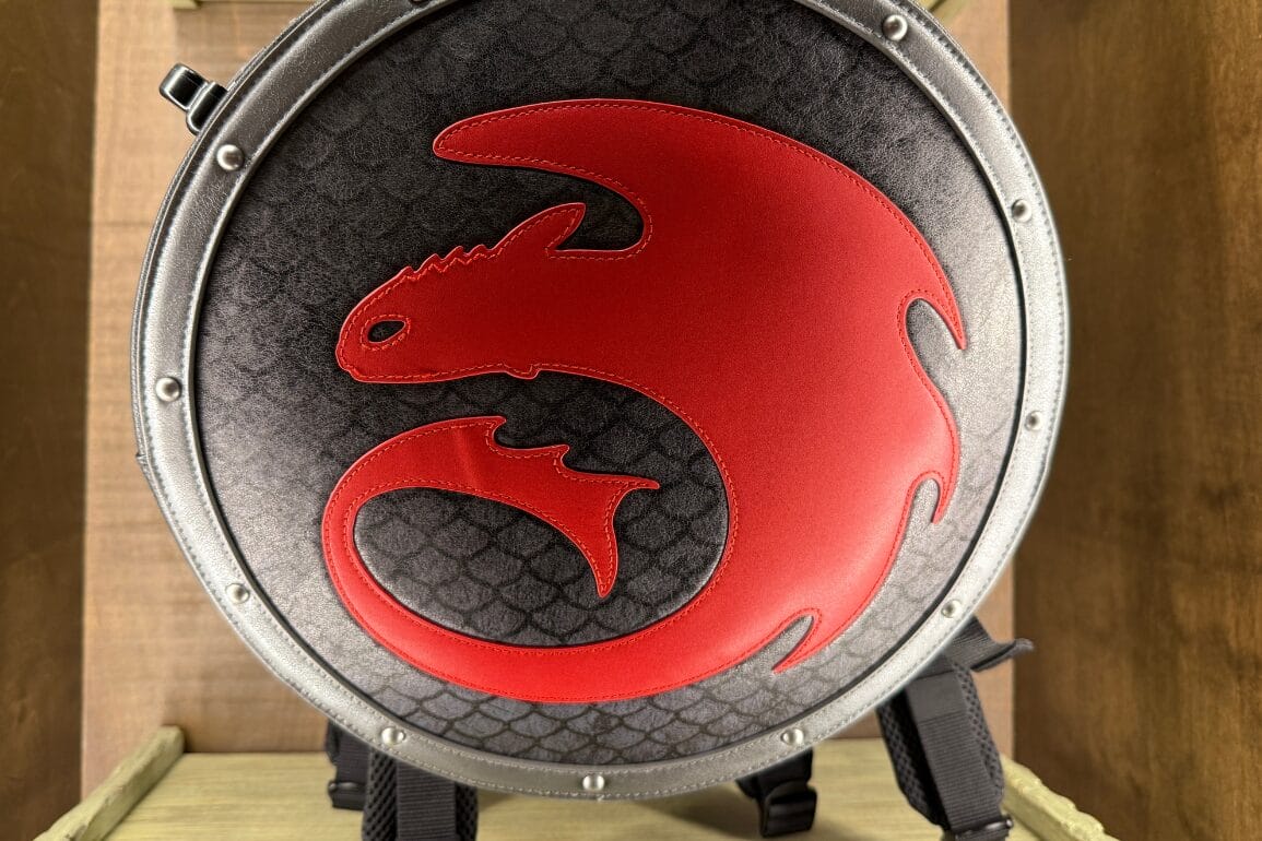 With a bright red icon of Toothless front and center, this round shield backpack is ready for battle—or adventure. Behind the icon are gray scales across the front of the shield. Surrounding the circular shield is a band of light grey leather with small stud embellishments.