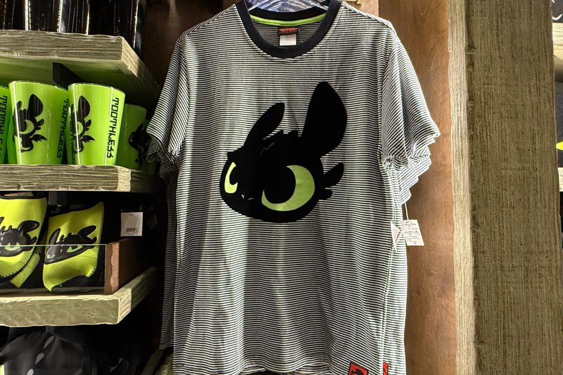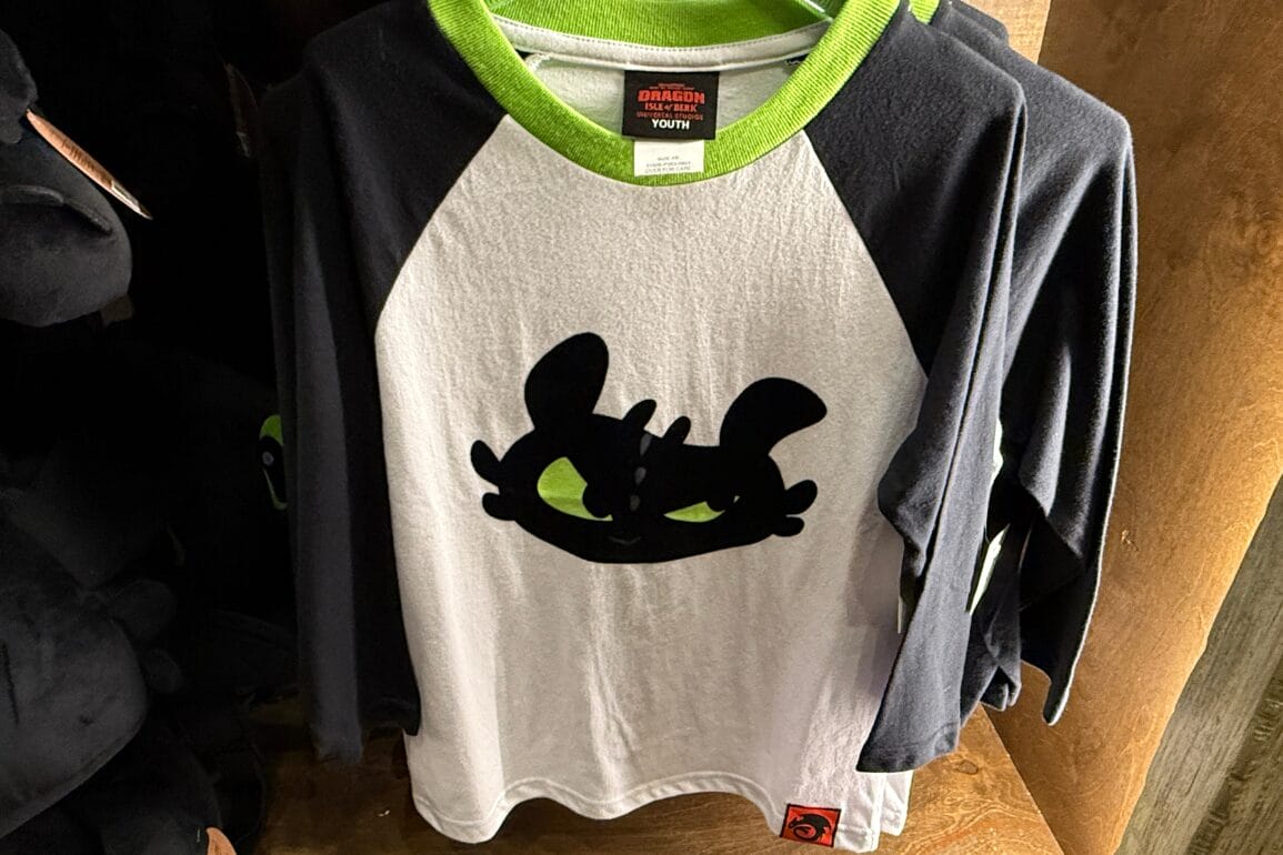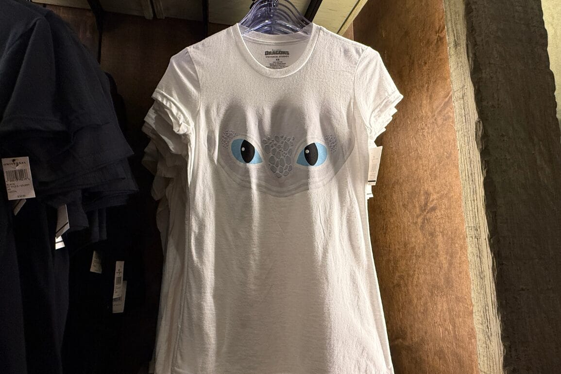This black T-shirt features a large image of Toothless’ face on the front. His face is more of a light grey to stand out against the black, and his bright green eyes are made of a glow-in-the-dark material.