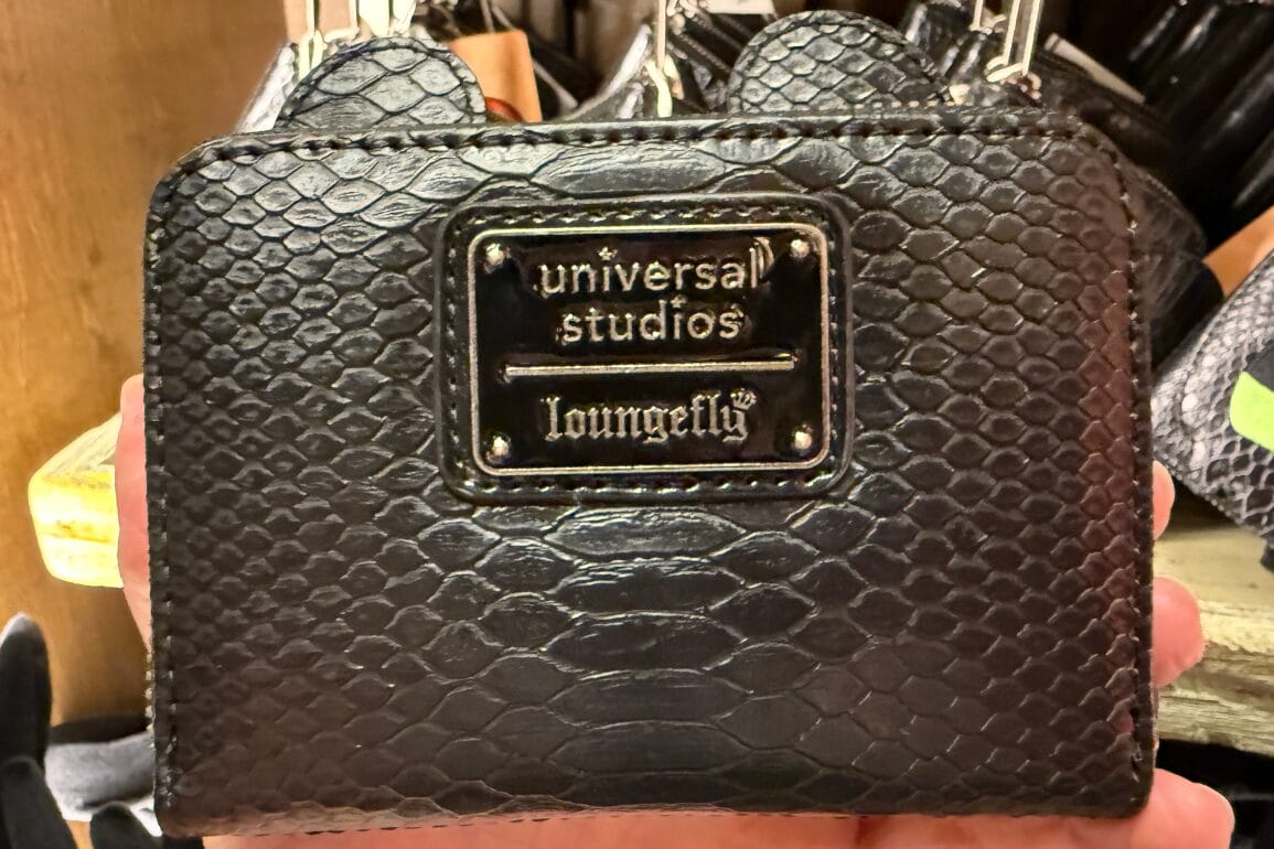 The back of the wallet features a square wallet body with a black Universal Studios and Loungefly plate affixed to the center. This plate is outlined in silver, with four stud embellishments—one in each corner.