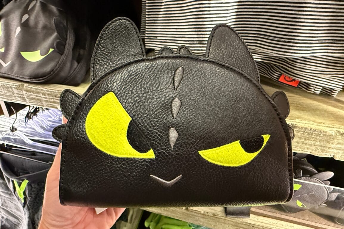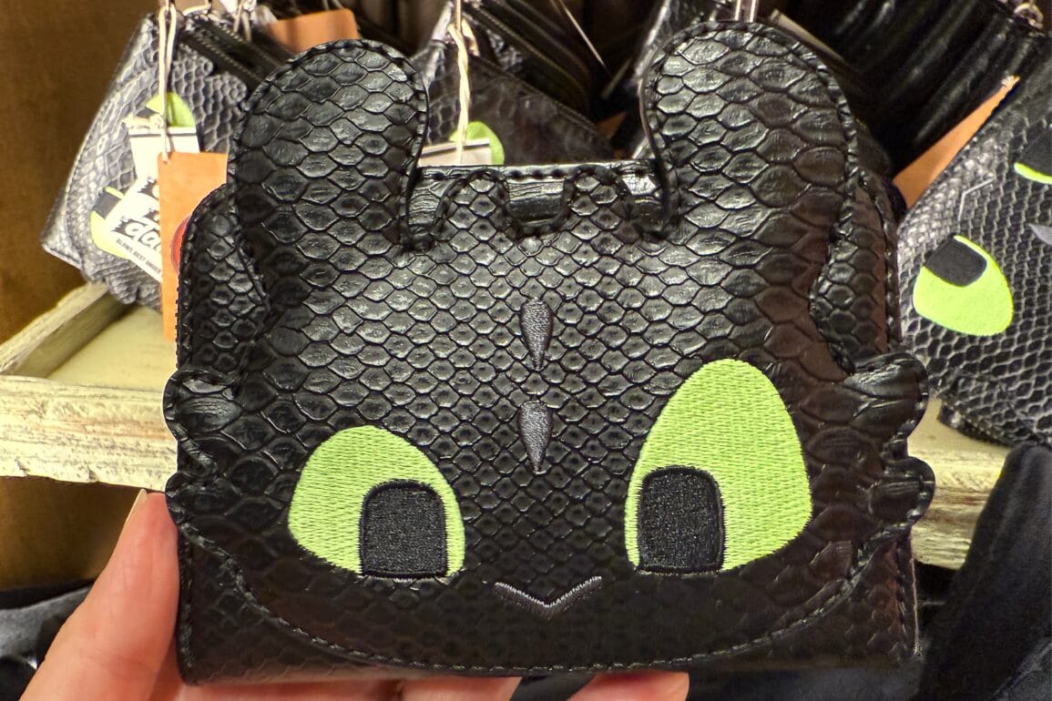 With black faux leather resembling dragon scales, this Loungefly Toothless wallet has a lot of texture. The front features the shape of Toothless’ face extending from the wallet body, with two of his facial spikes and his nose highlighted in black embroidery. His eyes are also embroidered in green, with a glow-in-the-dark feature that works best under UV light.