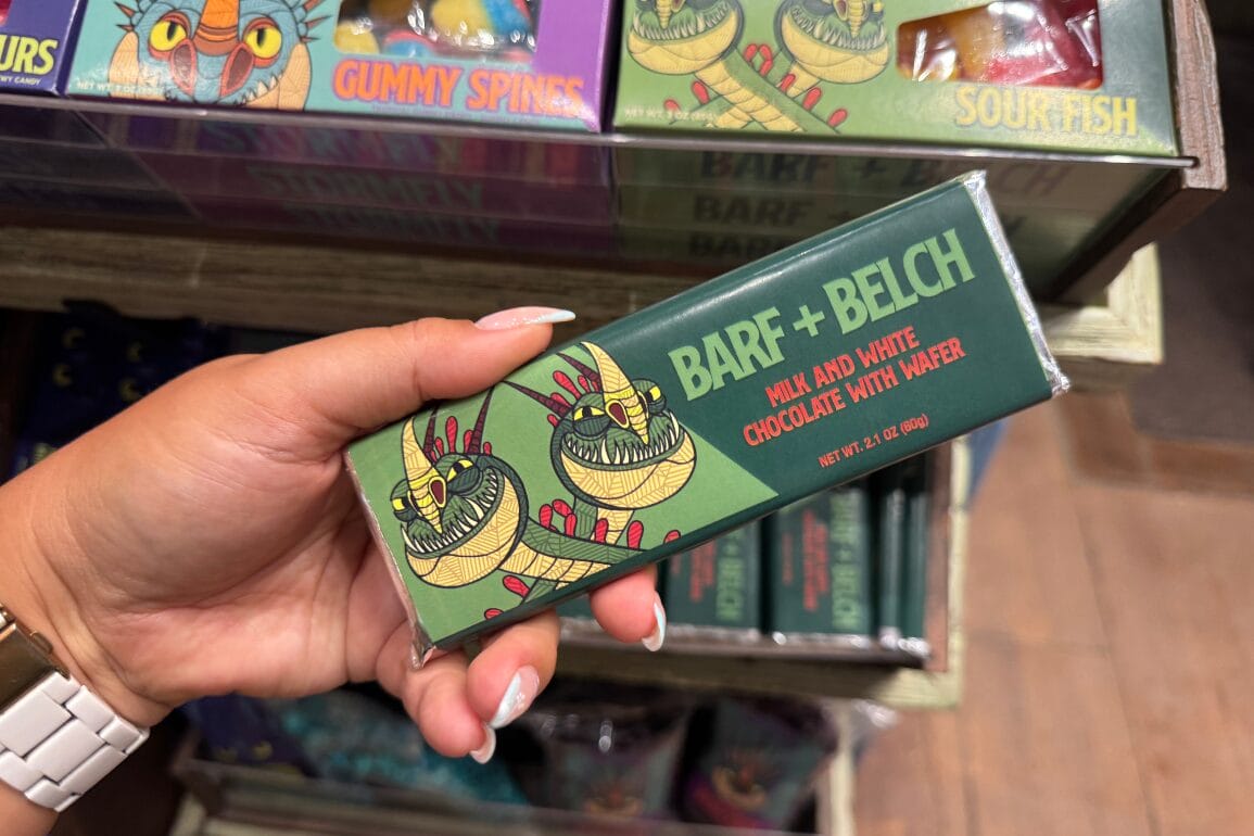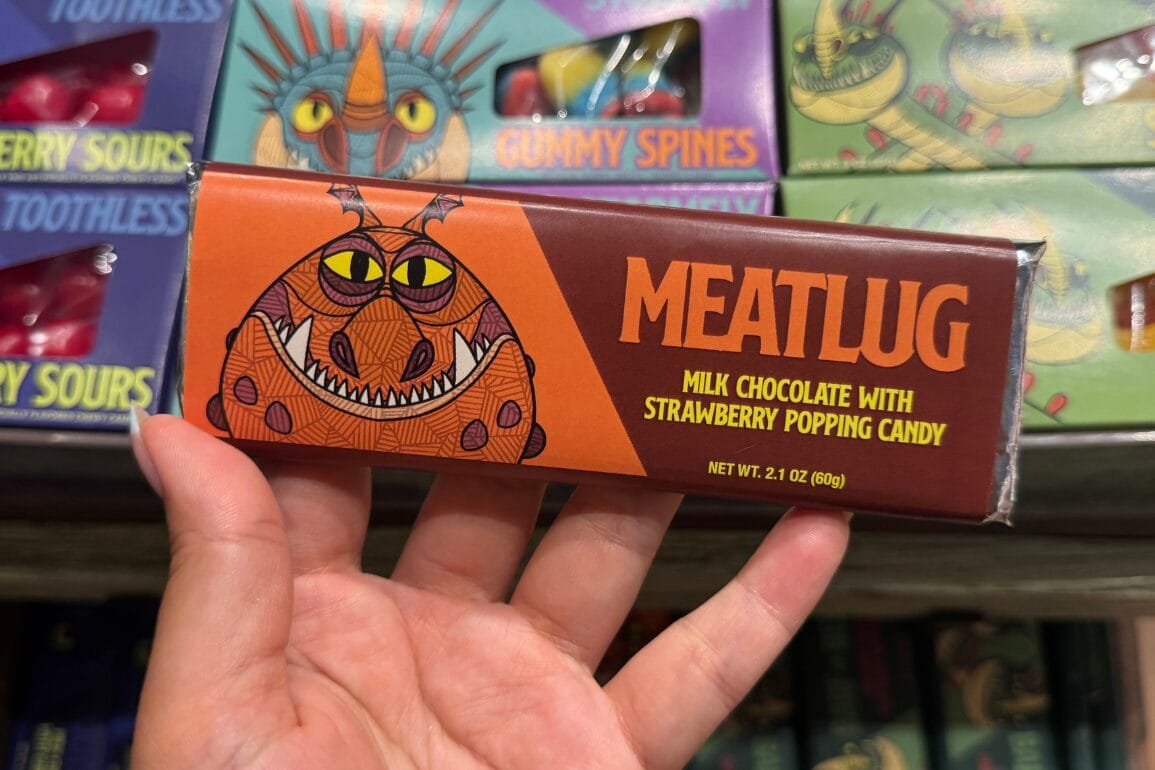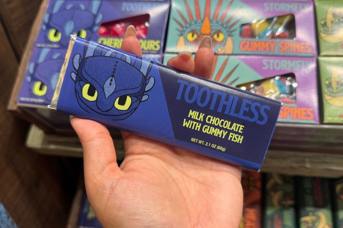 Each dragon also has a chocolate bar with a unique flavor and similar styling. Toothless has a bar of milk chocolate with gummy fish.