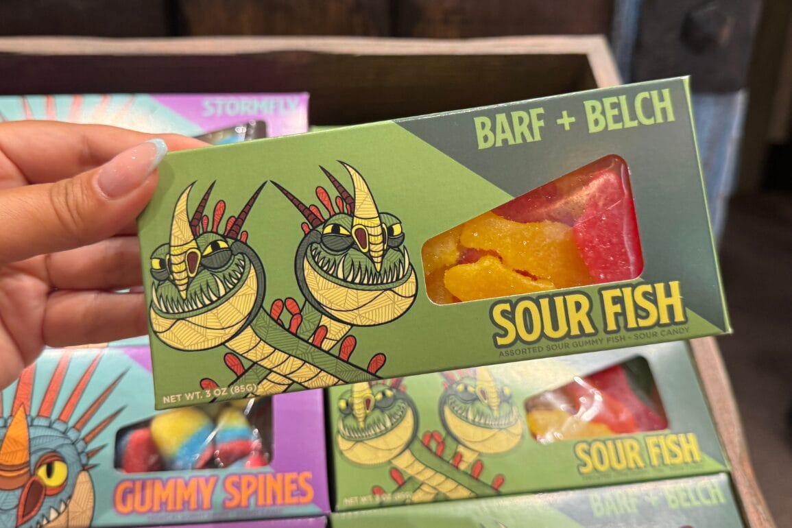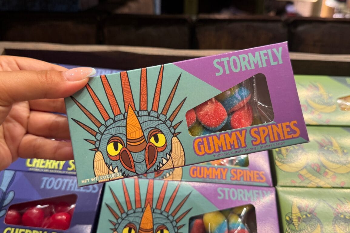 Each candy box has a treat themed to the dragon on the exterior. Matching the sharp spikes of Stormfly, this candy is red, yellow, and blue gummy spikes.