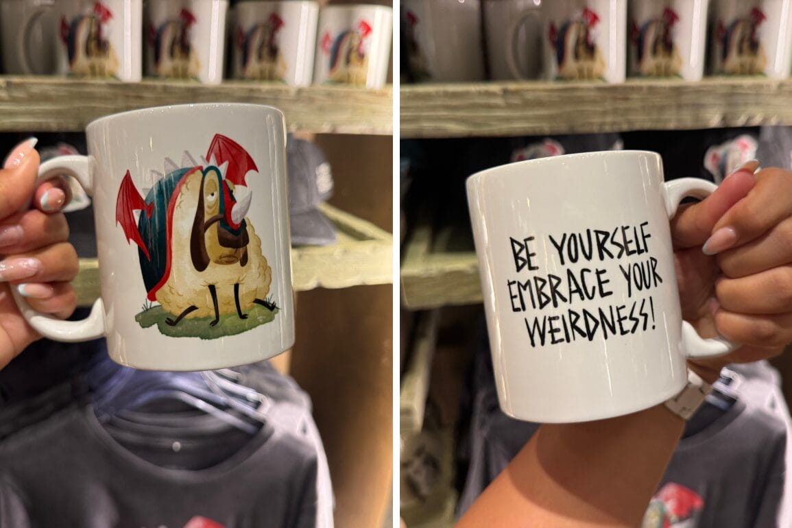 This mug is themed to the iconic Berk sheep. The base and handle are white, with art of a dragon-disguised sheep on one side. The other has the same “Embrace Your Weirdness” text as several of the other sheep items.