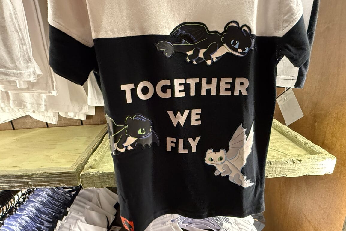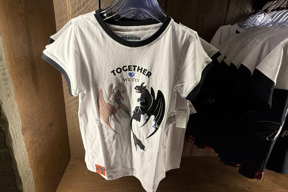 Following the theming of the Night Lights shirt, this white youth T-shirt featuring Toothless and the Light Fury also says “TOGETHER WE FLY” in the center.