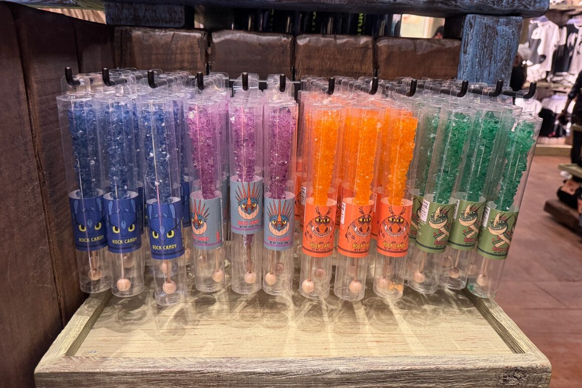 The next line of flavors is all rock candy, which is the standard sugary treat on an individual wood skewer. There are colors for Toothless, Stormfly, Meatlug, and Barf & Belch (Hookfang is sadly left out).
