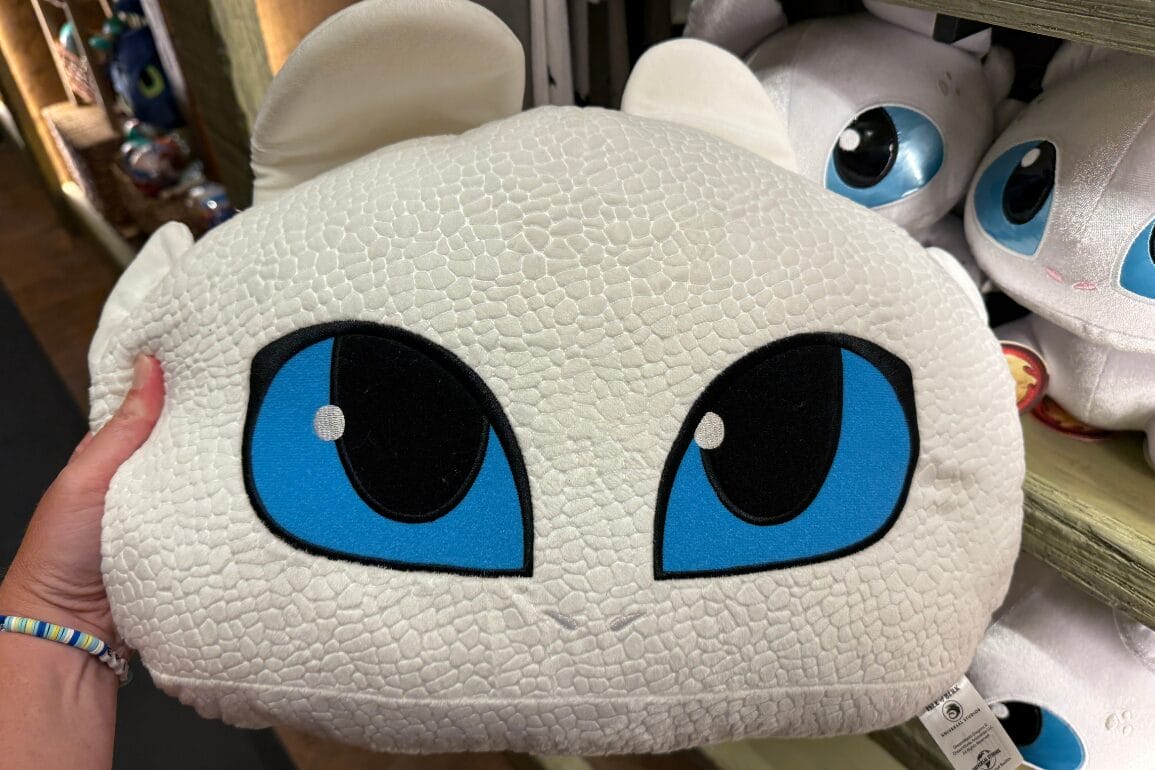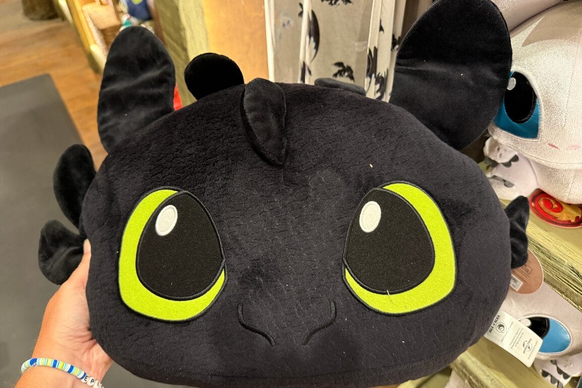 Similar in style to the Light Fury face pillow, the Toothless face pillow is black with texture for his scales. It also features his oversized green eyes.