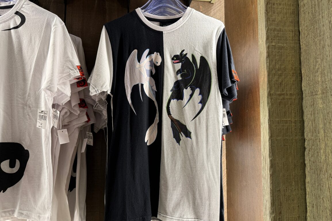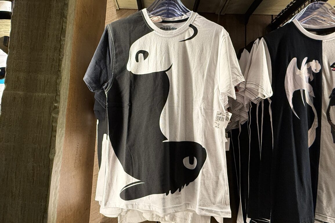Similar to the other Light Fury and Toothless T-shirt, this one features the two dragons juxtaposed with one another, similar to a yin-yang symbol. The right side is black and comprises Toothless, whose head is down toward the bottom of the shirt, while the left side is white and shows the Light Fury, whose head is near the top of the shirt.
