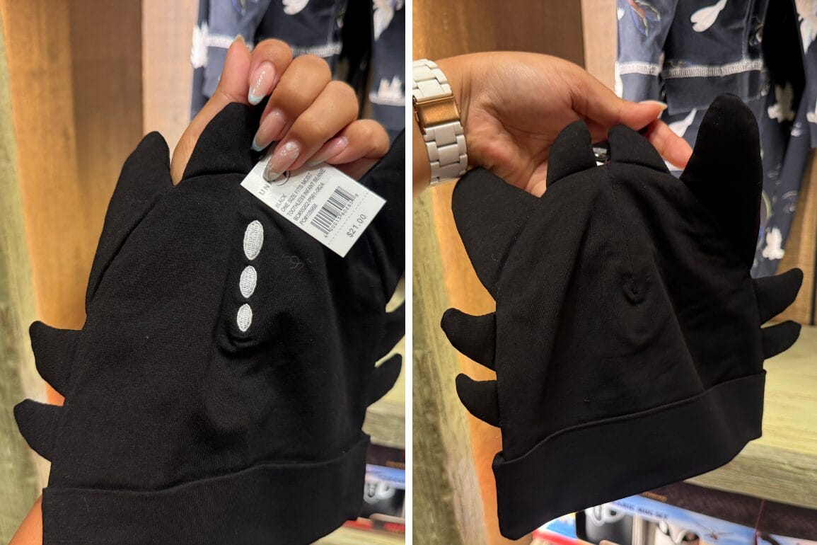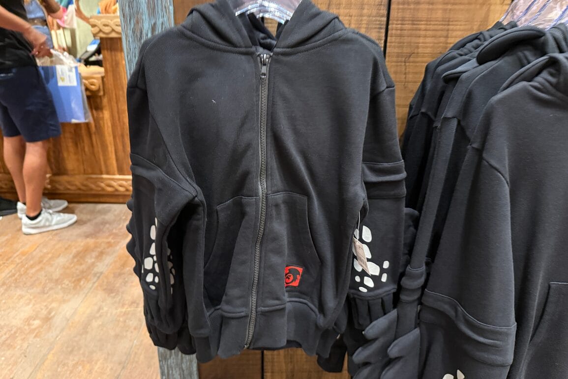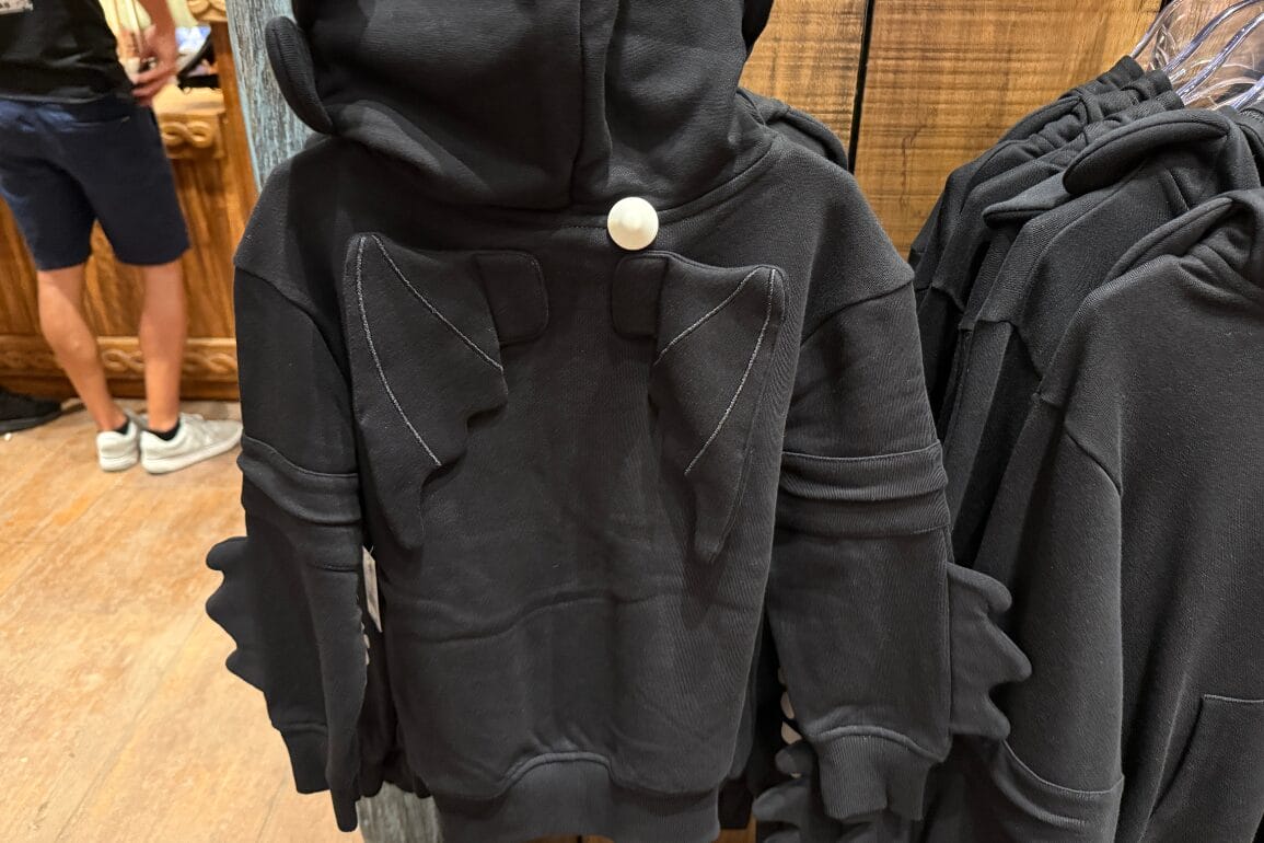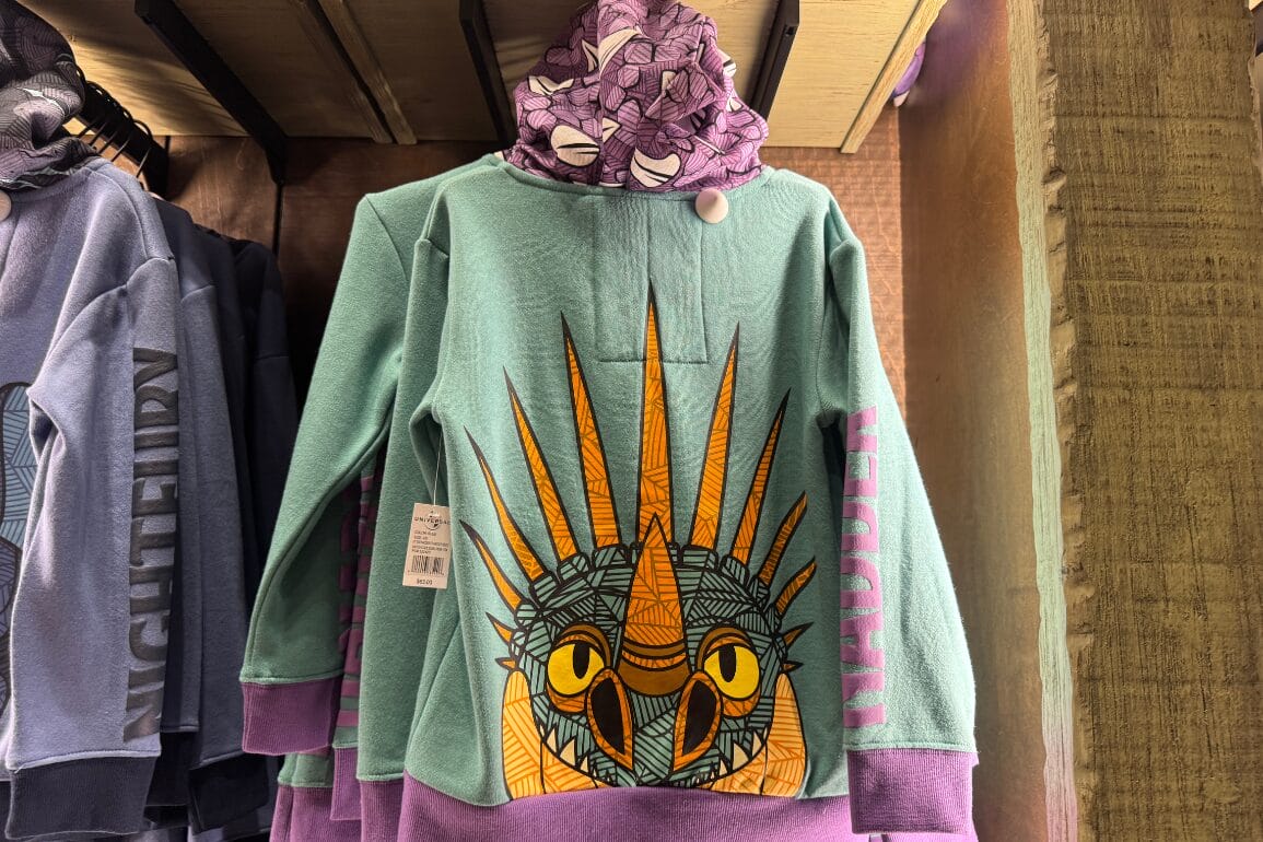 On the hood of the sweatshirt are three black fabric spines on each side. Additionally, Toothless’ bright green eyes and grey forehead spikes are featured prominently on the front of the hood.
