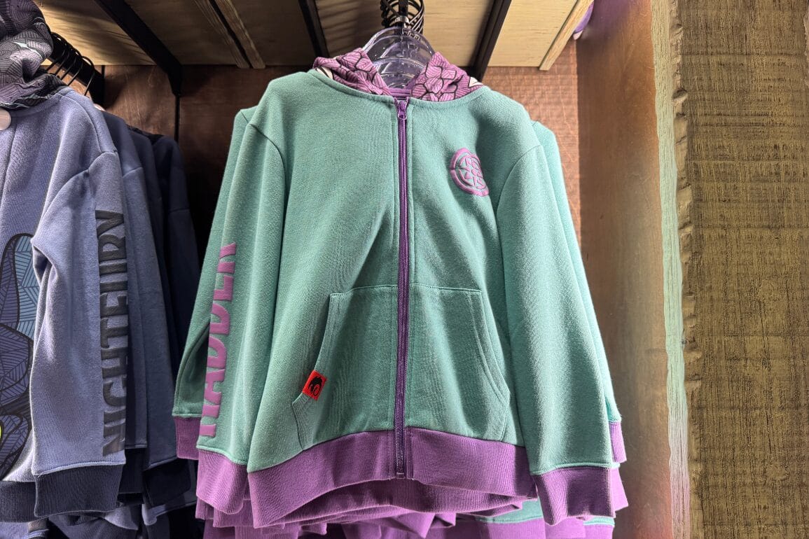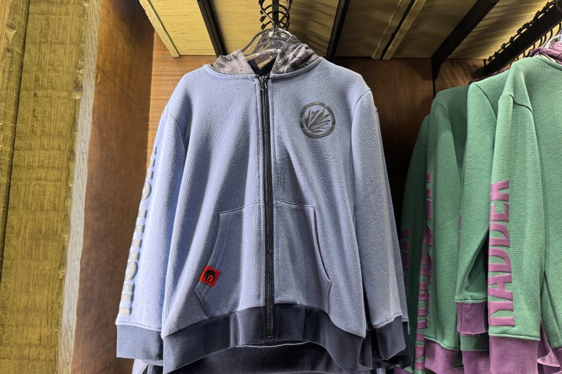 A violet zippered hoodie with an emblem that looks like Toothless’ tail on the left-hand side. The sleeve cuffs and bottom section of the sweatshirt are a deeper violet than the rest of the shirt.