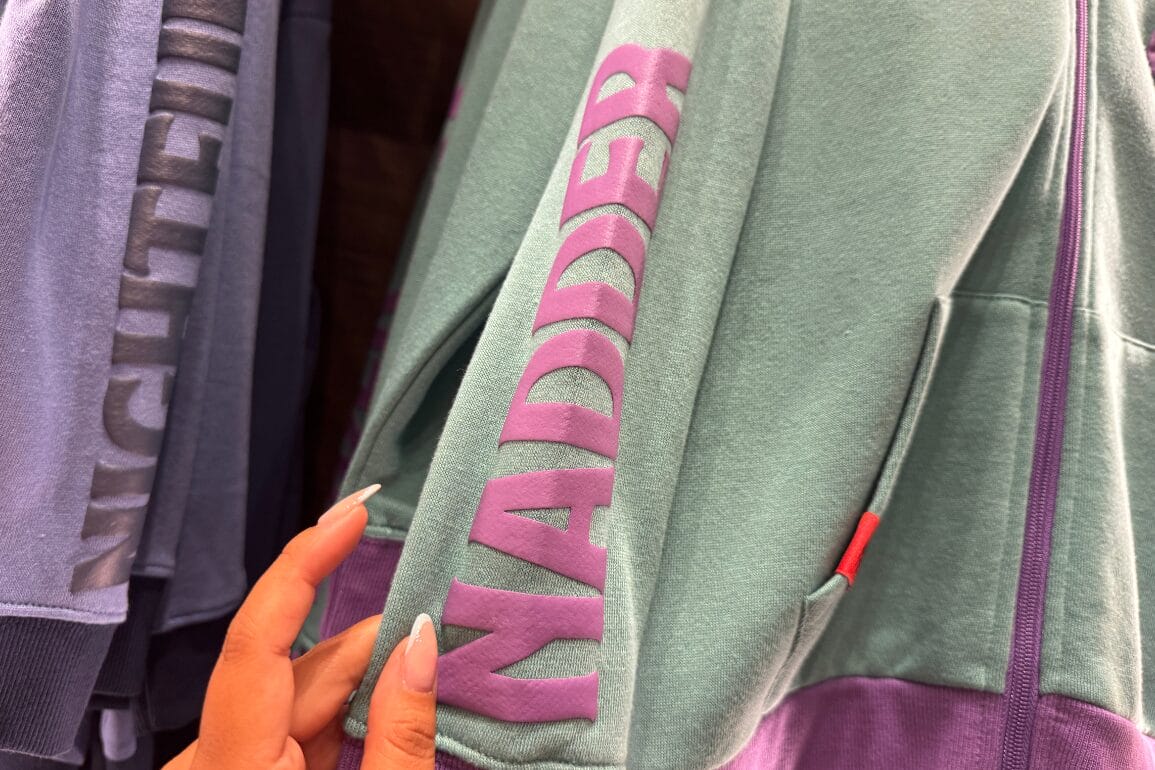 On the right sleeve is the word “NADDER” in the same accenting purple as elsewhere on the shirt in all capital letters.