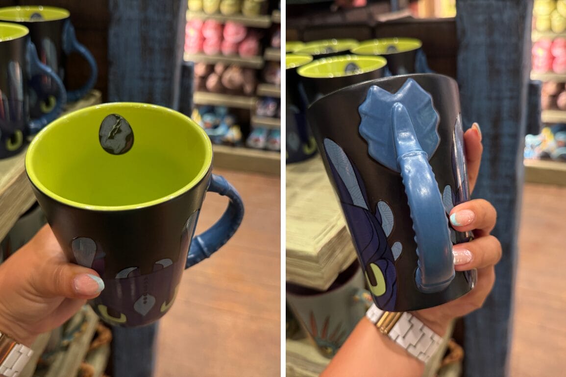 The handle is actually supposed to be Toothless’ tail, which has ridges and it’s signature fan shape at the top. The interior of the mug is lime green, and there is a small Night Fury egg icon on one side.