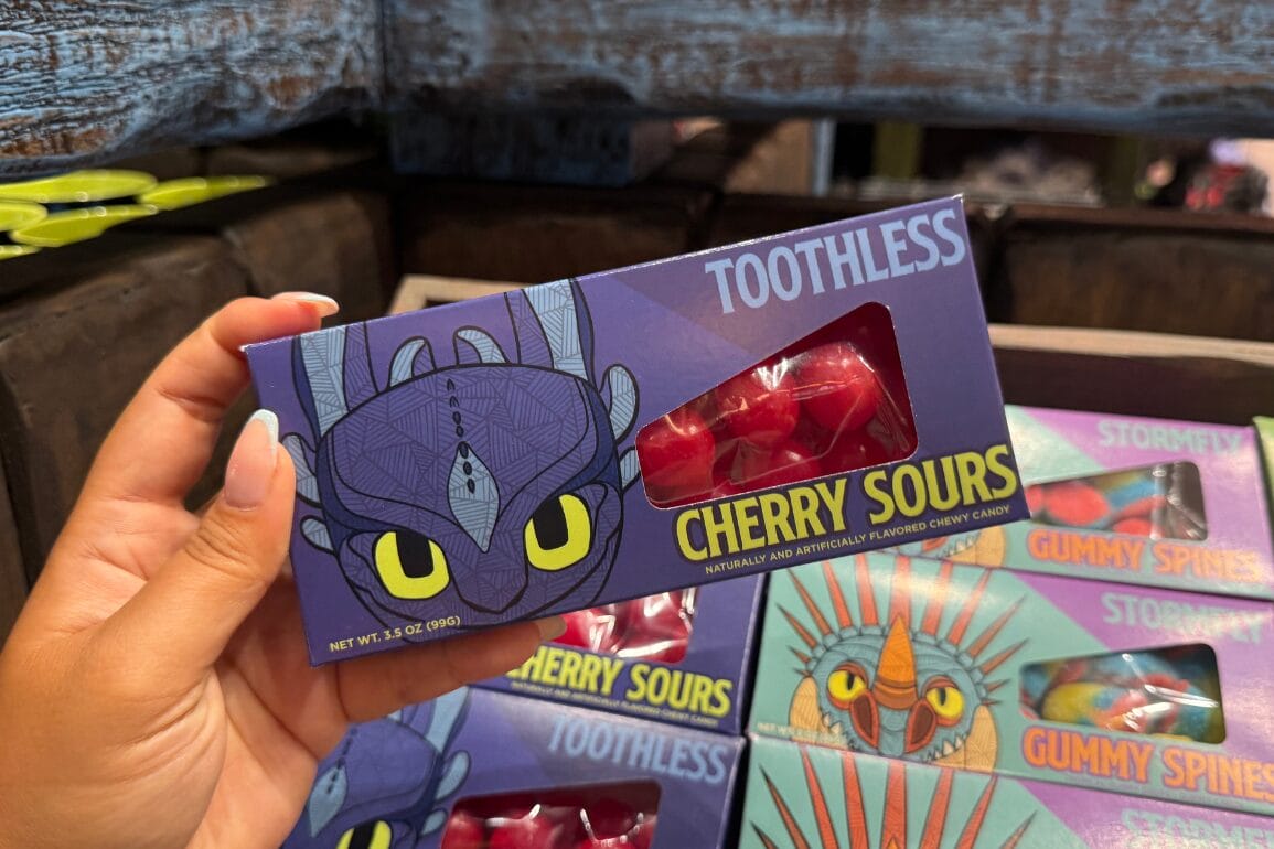 Toothless also has an awesome hoard of themes Berk snacks. Starting off, we have a box of Toothless Cherry Sours with his face on the front.
