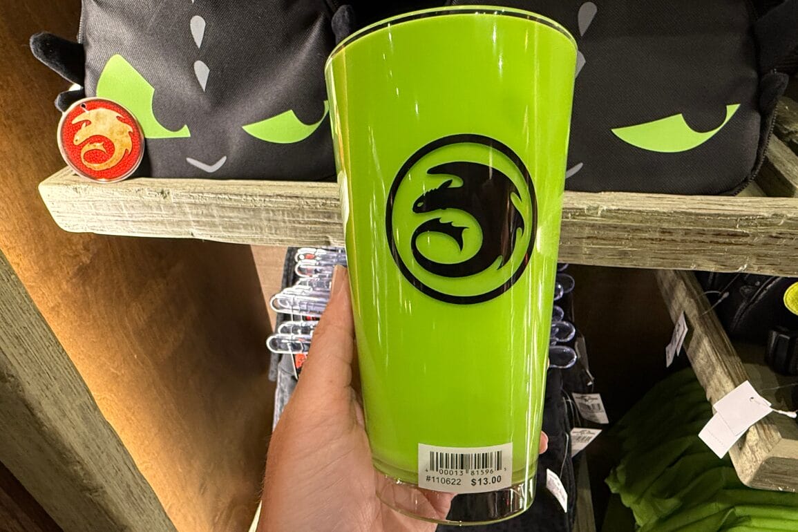 Likely intended for use at home rather than travel, this standard-shape glass is made of lime green plastic with the cute, wide-eyed art of Toothless on one side.